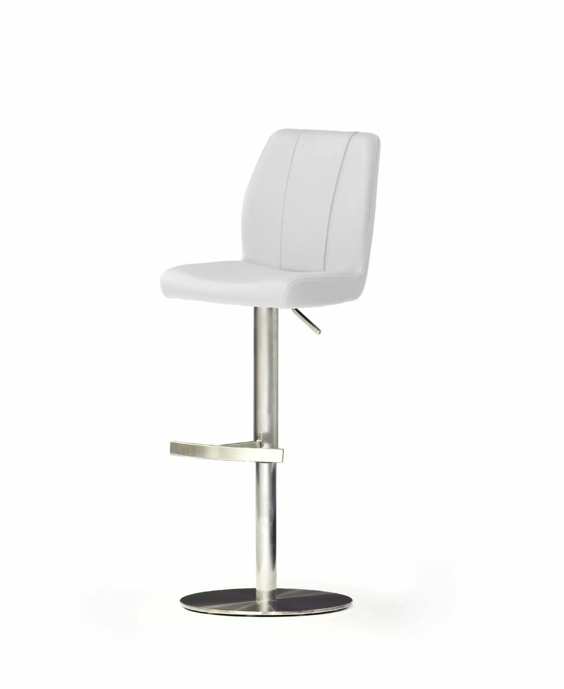 Top modern und höchst bequem präsentiert sich der Barhocker in einem weißen Lederlook. Der Barstuhl mit einem runden Edelstahlgestell lässt sich in der Höhe zwischen 89 und 114 cm verstellen. Ein Tellerfuß mit eckiger Liftsäule und Fußstütze rundet das attraktive Design des Hockers ab.