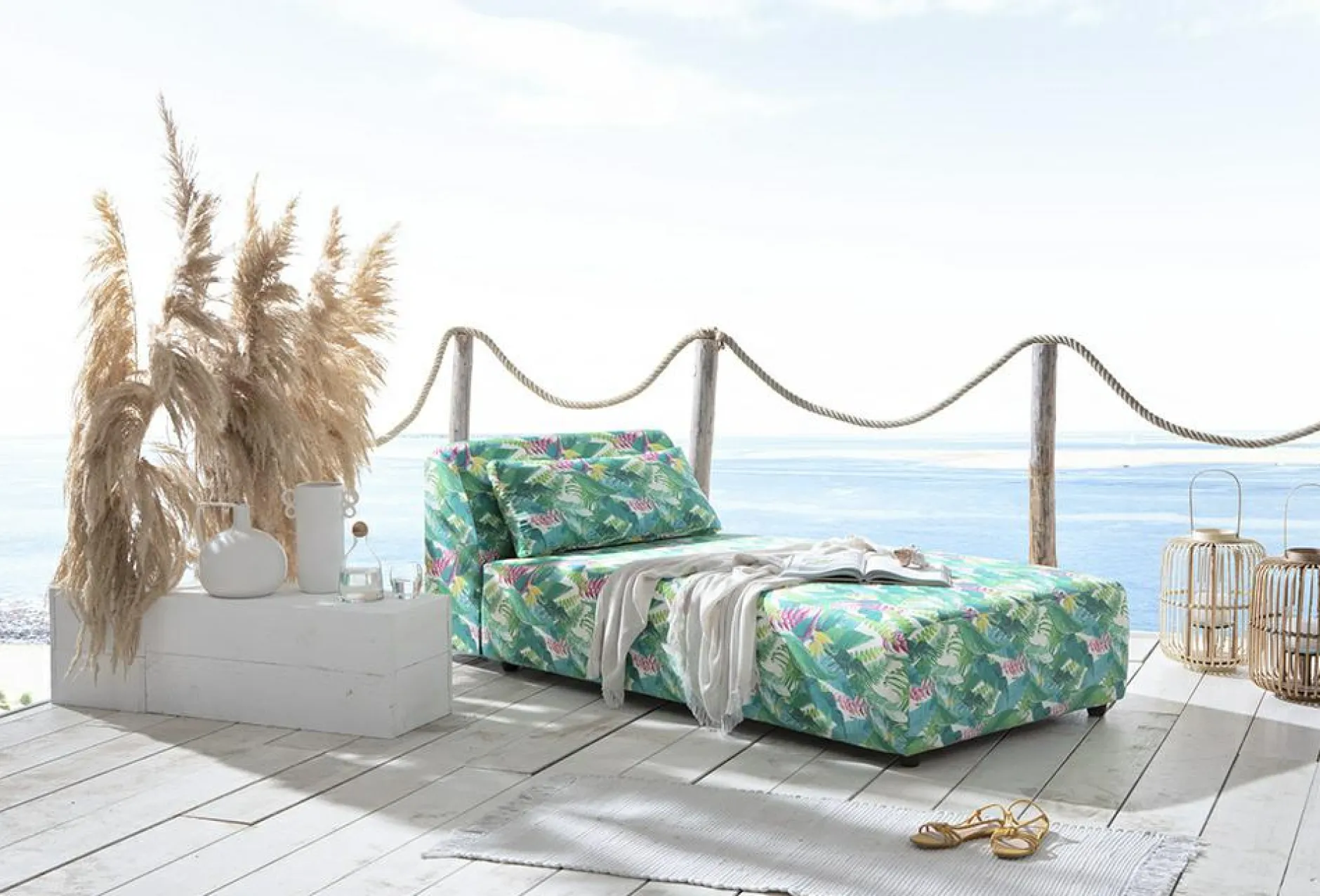 Das Daybed Risum aus dem Hause SANSIBAR LIVING bringt den Urlaub ein Stück zu Ihnen auf die Terrasse. Das farbenfrohe Design ist ein absoluter Hingucker und wird Familie und Freunde staunen lassen. Das Element ist mit einem floralen Stoff bezogen. Der Outdoor-Bezug ist dabei wasserabweisend, antibakteriell und besitzt eine hohe Lichtechtheit. Das Gestell ist aus wasserdichtem Brettsperrholz gefertigt. Für höchsten Sitzkomfort sorgen die Sitzfüllung aus Polyetherschaum, sowie die Sitzunterfederung aus Nosagfedern. Die Füße sind in einem schlichten schwarz gehalten. Im Lieferumfang ist ein Rückenkissen enthalten.