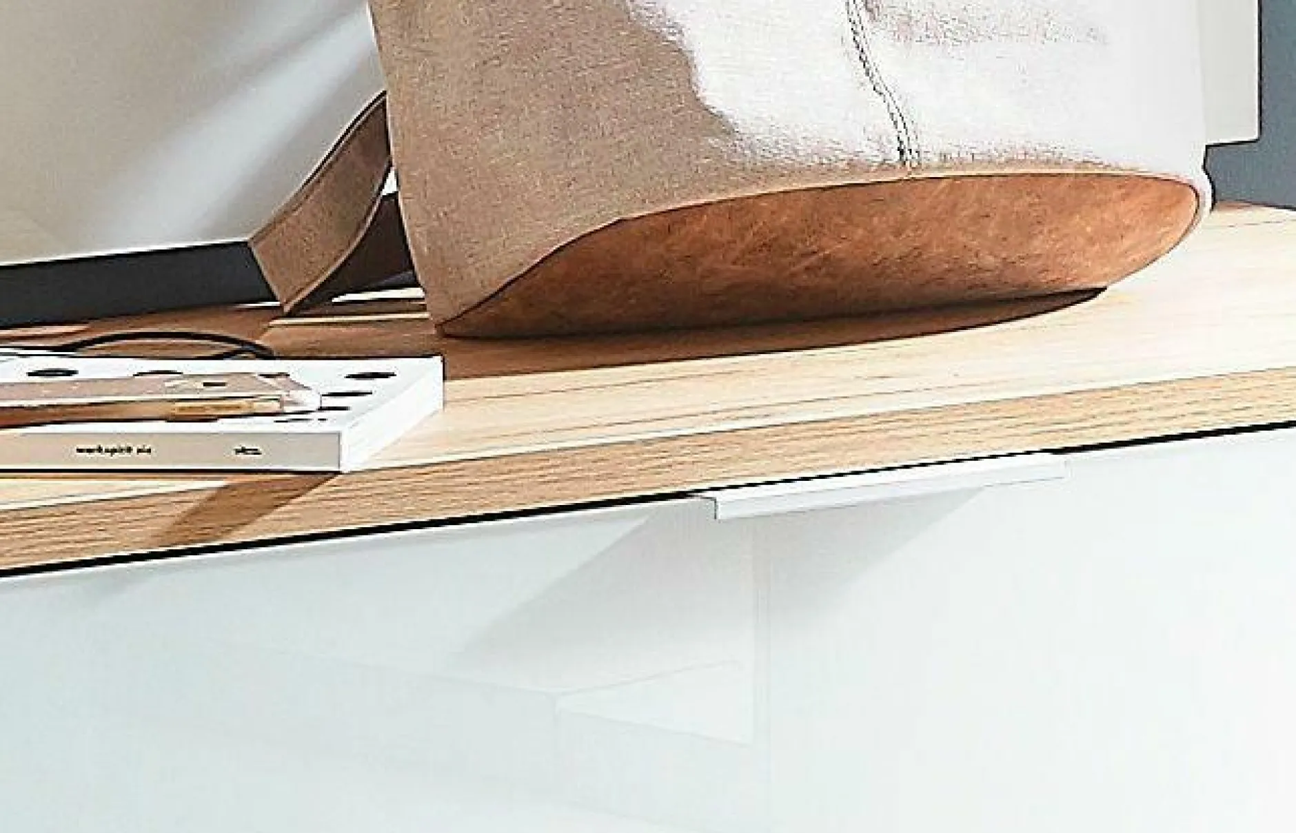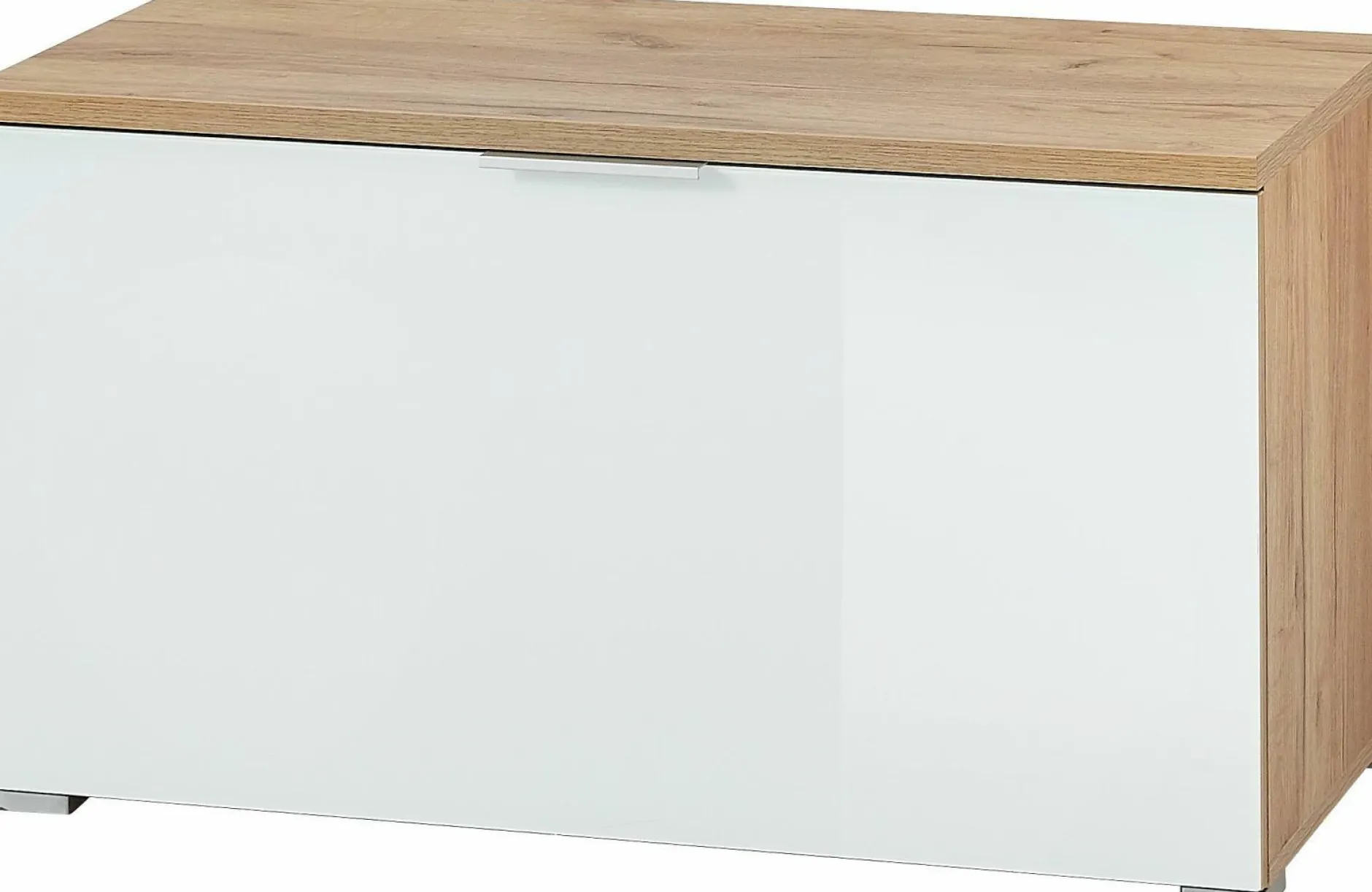 · Schuhbank mit einer Klappe mit Glasfront und einem Kantengriff aus Metall, dahinter eine Mittelseite und zwei verstellbare Einlegeböden (jeweils belastbar bis zu 10 kg), Oberboden (kurzzeitig belastbar bis zu 90 kg), Unterboden (belastbar bis zu 15 kg), Korpus in Navarra-Eiche-Nb., Front in Weiß-ESG, vier Füße aus Kunststoff, Platz für 8 Paar Schuhe, Melaminharzbeschichtung, Einscheibensicherheitsglas, hochwertige ABS-Kanten, Made in Germany.
