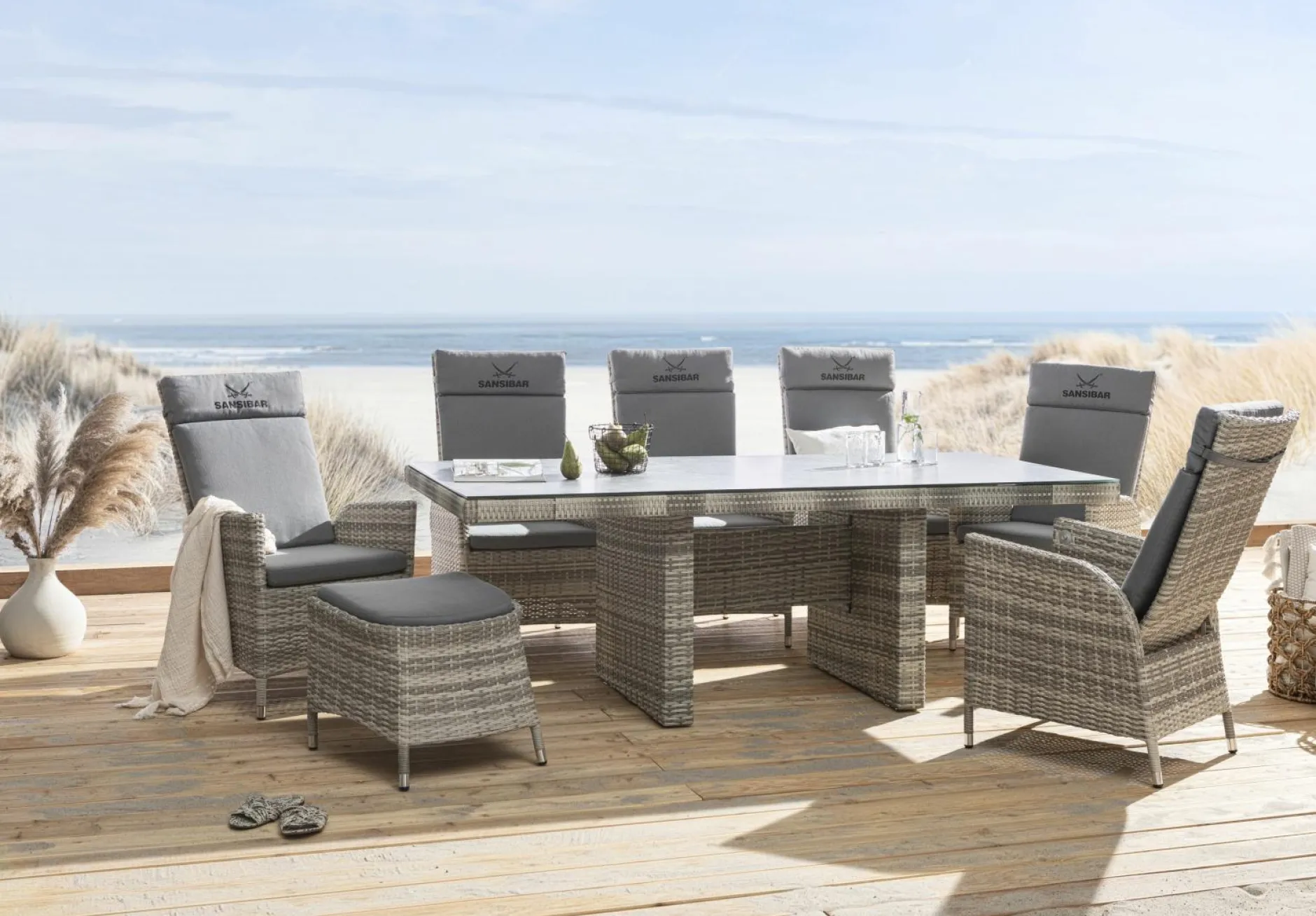 Entdecken Sie die Schönheit und die Funktionalität des Gartentisches WYK von SANSIBAR, der mit seinem modernen Design und hochwertigen Materialien Ihr Gartenparadies vervollständigt. Der Tisch bietet Ihnen ausreichend Stellfläche für Teller, Tassen und Gläser und ist somit ideal geeignet für gemeinsame Mahlzeiten im Grünen. Die großflächige Tischplatte aus Glas mit Keramikbeschichtung vereint Ästhetik mit Langlebigkeit. Sie wird von einem Aluminiumgestell mit Kunststoffgeflecht in doppelt halbrundem Design ergänzt. Mit den Abmessungen LBH 100x212x74 cm ist dieser Gartentisch perfekt dimensioniert. Der Tisch ist nicht nur ein Blickfang für Ihren Außenbereich, sondern harmoniert auch perfekt mit anderen Möbelstücken aus der WYK Kollektion. Genießen Sie entspannte Stunden im Freien in einem stilvollen Ambiente mit dem Gartentisch von SANSIBAR.