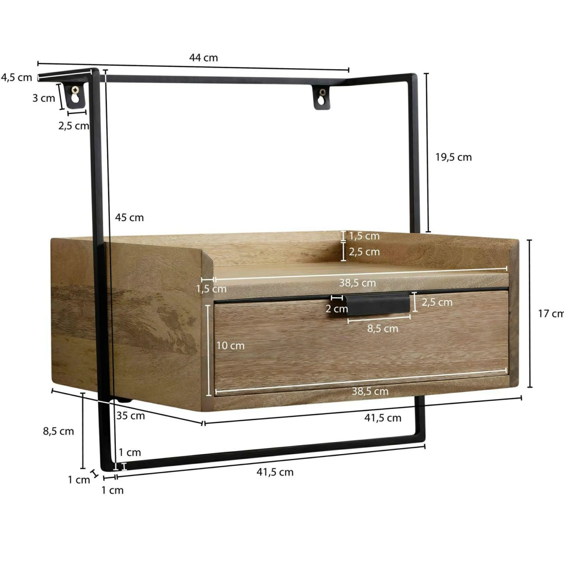 · Abmessungen – Breite: 44 cm // Höhe: 45 cm // Tiefe: 35 cm // Innenmaße Schublade (BxHxT): 38,5 x 10 x 30,5 cm // Obere Ablagefläche (BxT): 38,5 x 25 x 33,5 cm.