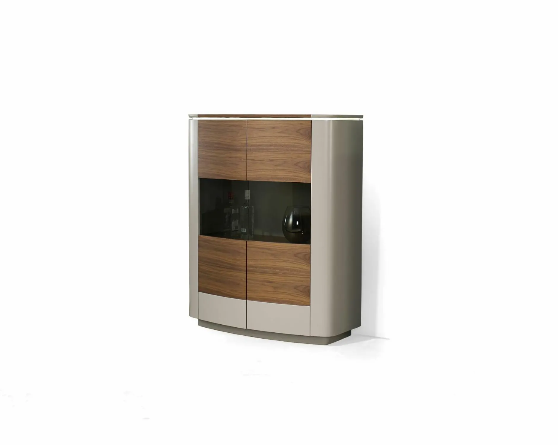 Mit der Vitrine Dantaro aus dem Hause DSIGN stellen Sie Ihr liebstes Hab und Gut gekonnt in Szene. Das schicke Design ist dabei ein absoluter Hingucker und wird Ihrem Wohnbereich perfekt aufwerten. Korpus und Front sind mit einem Lack in aschgrau versehen. Die Akzente aus furniertem Nussbaum runden dabei das Design perfekt ab. Die Vitrine kommt mit zwei Türen mit Glaseinsätzen und zwei festen Einlegeböden, sowie zwei verstellbaren Einlegeböden. Zusätzlich ist sie mit einem Deckblattakzent versehen. Auf Wunsch ist LED-beleuchtung erhältlich.