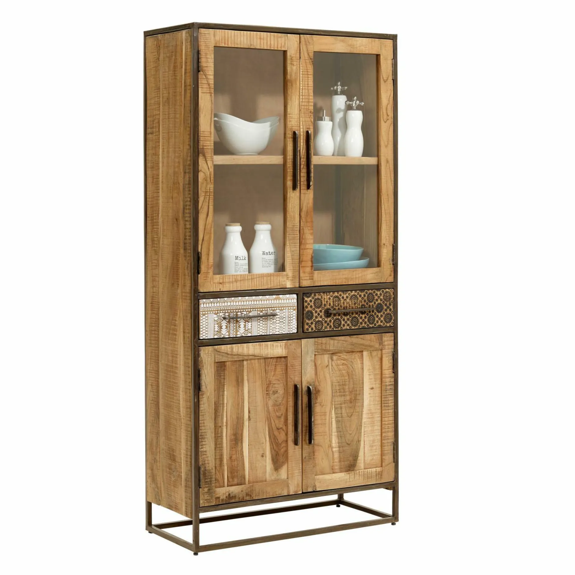 Bereichern Sie Ihren Wohnraum mit der Vitrine Wake Up von Wolfmöbel. Dieses hochwertige Element ist aus massiver Akazie gefertigt und bringt einen rustikalen Charme in Ihre vier Wände. Darüber hinaus sorgen die schwarzen Metallrahmen für einen attraktiven Kontrast. Neben einer angenehmen Optik mit rauer Oberfläche und hellbrauner Holzfarbe bietet diese Vitrine mit zwei Glas- und zwei Holztüren sowie zwei Schubladen mit schönem Print reichlich Stauraummöglichkeiten. Naturfarbene Metallgriffe runden den Look ab und erleichtern die Bedienung.