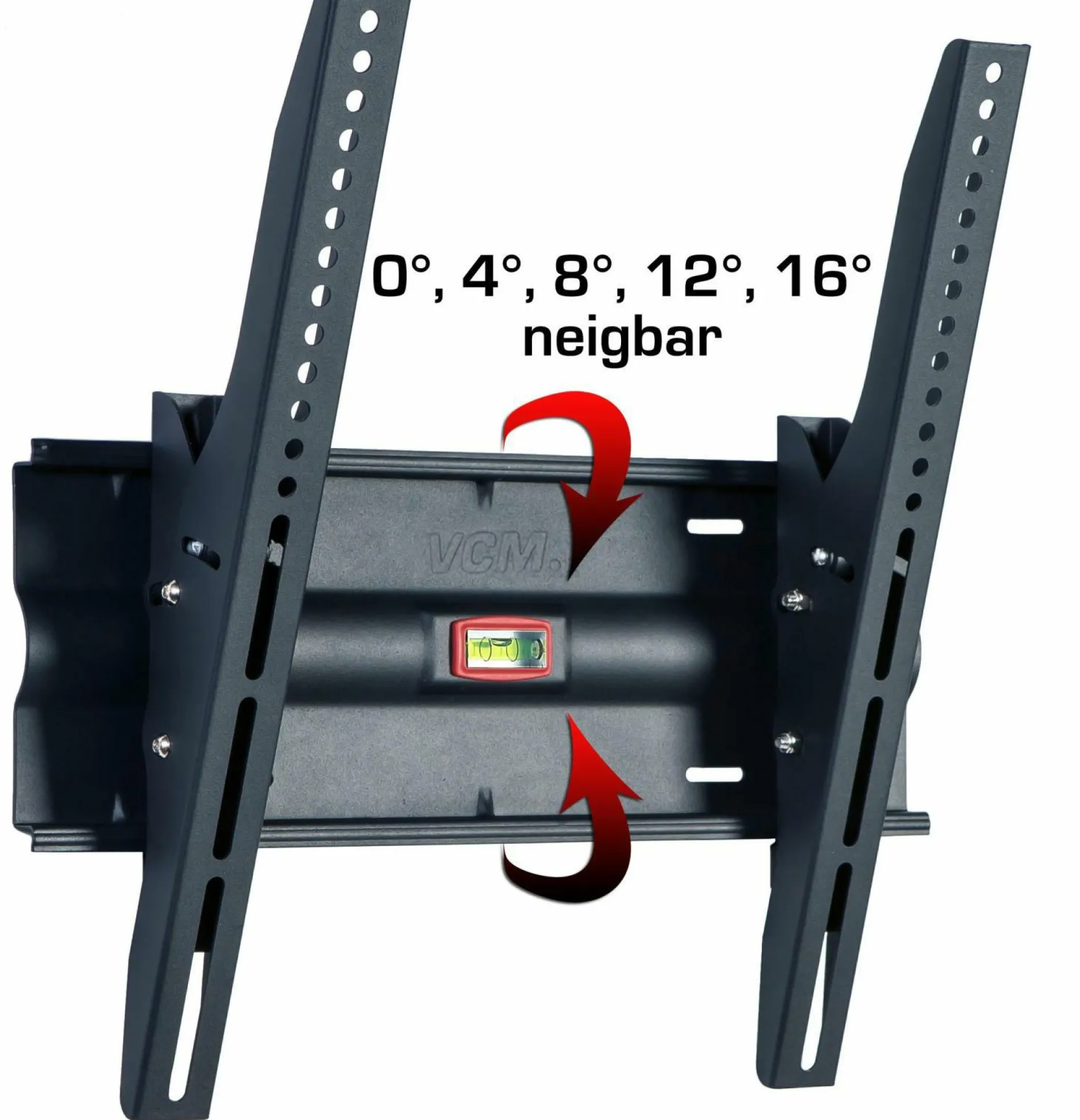 · VCM universelle Wandhalterung WN 110 neigbar. Für alle handelsüblichen Flachbildschirme in den Größen von 22-37 Zoll (55-94cm) bis max. 35 Kg. Wandabstand 6,1 cm. Neigbar in 5 Positionen: 0°, 4°, 8°, 12° und 16°. VESA kompatibel mit 100×100, 200×100, 200×200, 300×100, 300×200, 300×300, 400×100, 400×200, 400×300, 400×400 mm. Einfache und sichere Montage des Displays durch ein bewegliches Schienensystem mit integrierter Wasserwaage. Aus hochwertigem Stahl. Die Lieferung erfolgt inkl. aller Befestigungsmaterialien, Montageanleitung und Montagematerial.