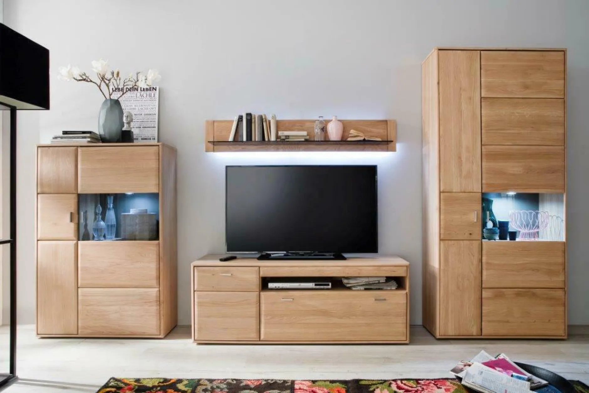 Front: Eiche Bianco massiv geölt Korpus: außen Eiche Bianco furniert / innen Eiche Bianco Nachbildung Glas in Parsol grau Rückwand hinter Glas: taupefarbig Dekor Schubkästen und Glastüren gedämpft Wohnwand best. aus: Vitrine, Lowboard, Highboard und Wandboard >>> Preis ohne Beleuchtung <<>> Maße ca. Montagemaße <<<