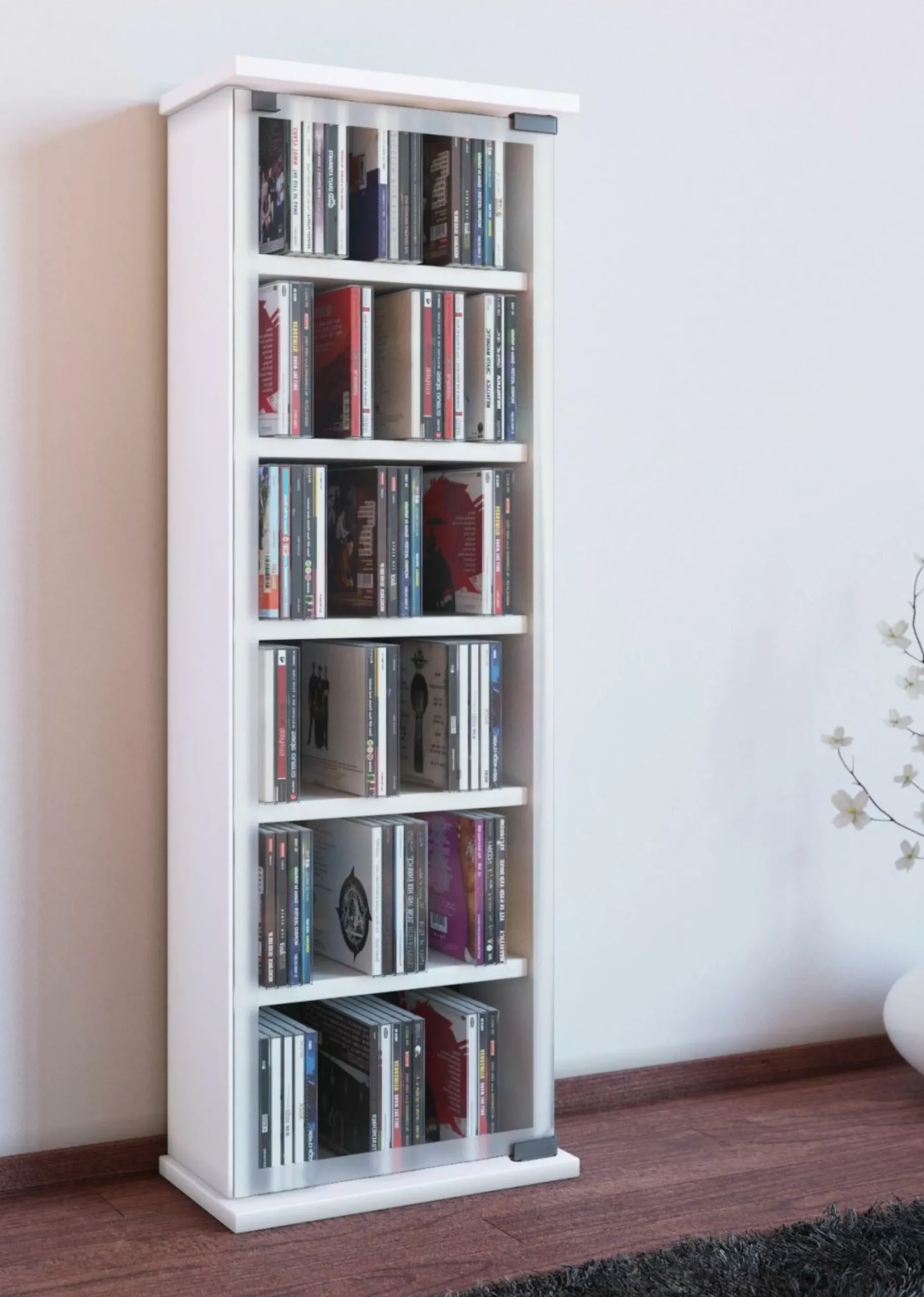 · VCM CD/DVD Möbel Classic mit einer ESG-Sicherheitsglastür.Die Glastür ist durch keramisches Druckverfahren mit einer hochwertigen Bedruckung versehen. 5 variable Einlegeböden bieten Archivierungsmöglichkeiten für 150 CDs oder 65 DVDs oder 36 Videos. Holzstruktur-Nachbildung. Abmessungen: Höhe 91,5 x Breite 31 x Tiefe 18 cm.