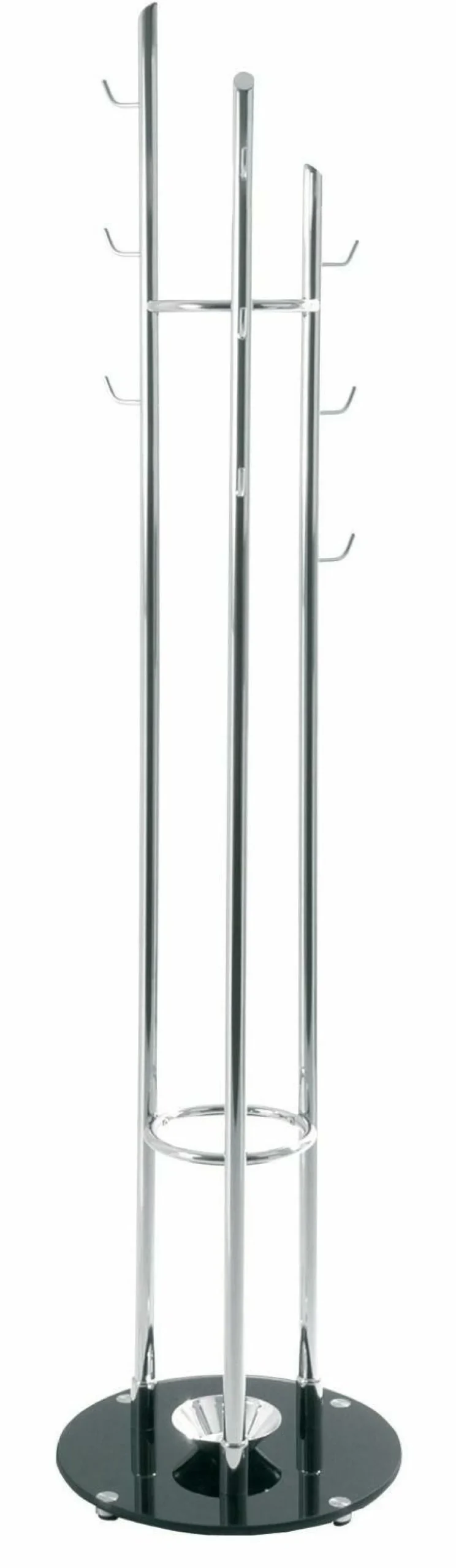 Mit einer runden Bodenplatte erhält der Kleiderständer Stabilität. Platz für Regenschirme und viele Jacken bietet die Garderobe mit Haken und einer Kleiderstange.