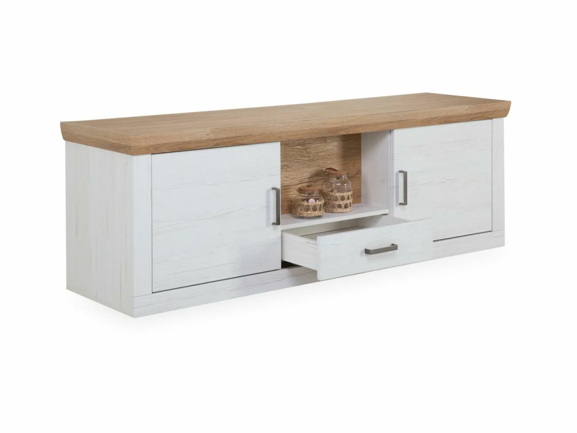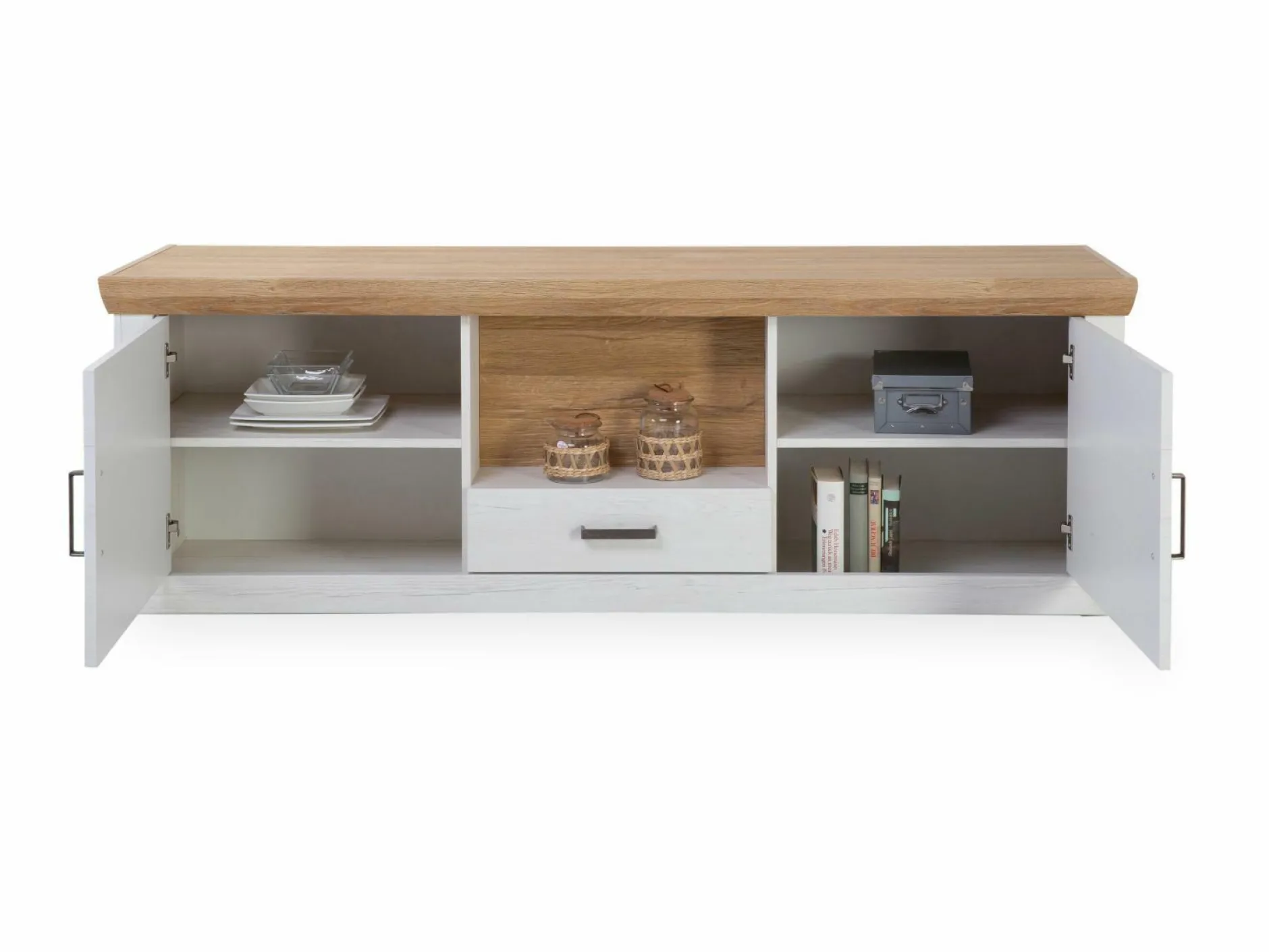 · 2 Türen (links und rechts), 1 Schublade und 1 offenes Fach