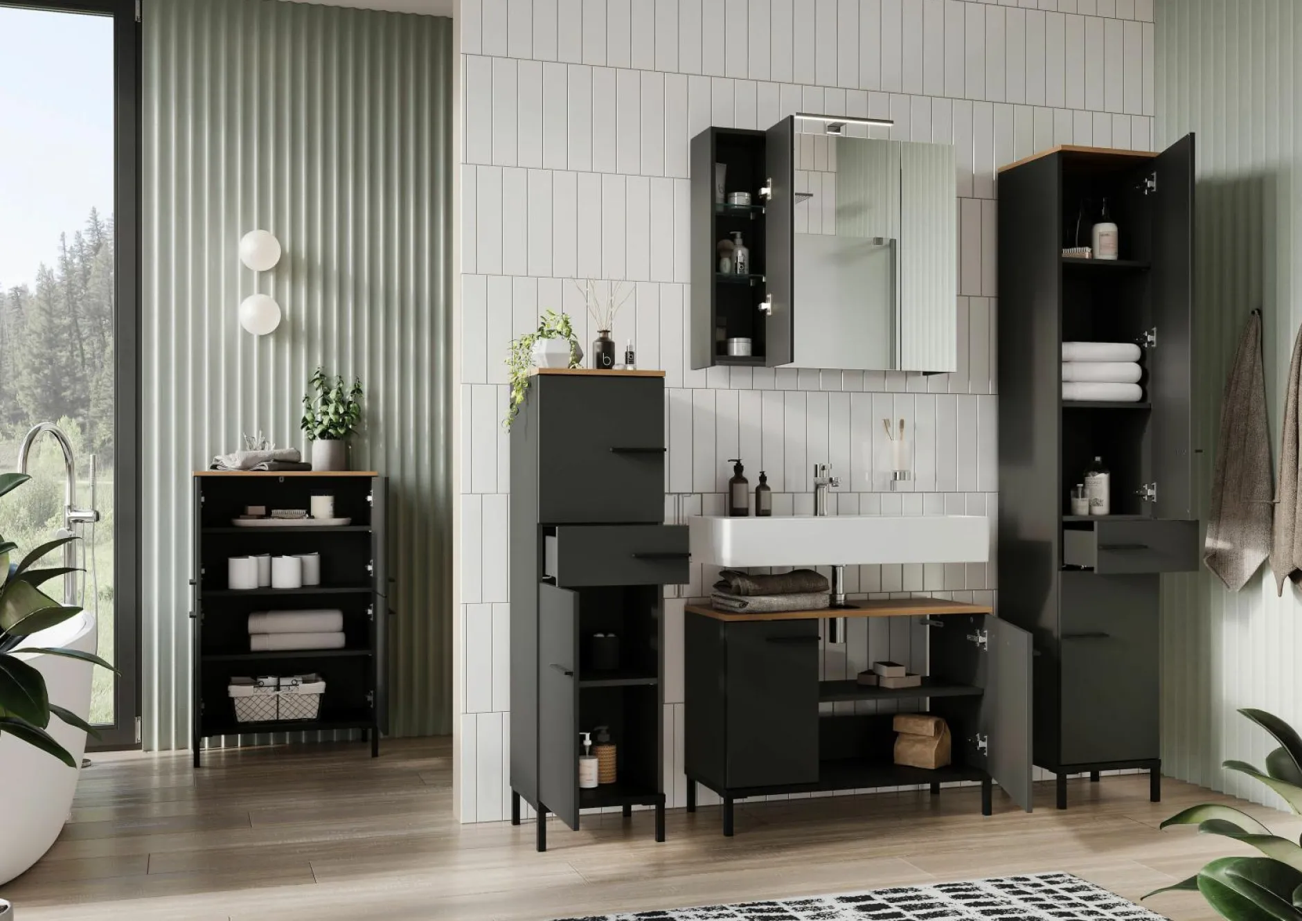 · Schrank mit einer Schublade (belastbar bis zu 10 kg) und zwei Türen – dahinter je ein verstellbarer Einlegeboden (belastbar bis zu 10 kg), Unterboden in Schwarz (belastbar bis zu 15 kg), Oberboden in Navarra-Eiche-Nb. (belastbar bis zu 10 kg), Rest in Graphit, drei Steggriffe und vier hohe Füße aus Metall in Schwarz, Melaminharzbeschichtung, hochwertige ABS-Kanten, Türen rechts/links anschlagbar, Türdämpfung, Selbsteinzug der Schublade, Made in Germany.