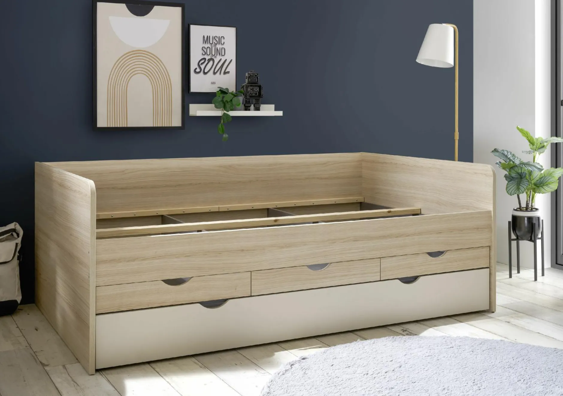 · mit drei Schubladen und einer zusätzlichen ausziehbaren Liegefläche in 90×200 cm