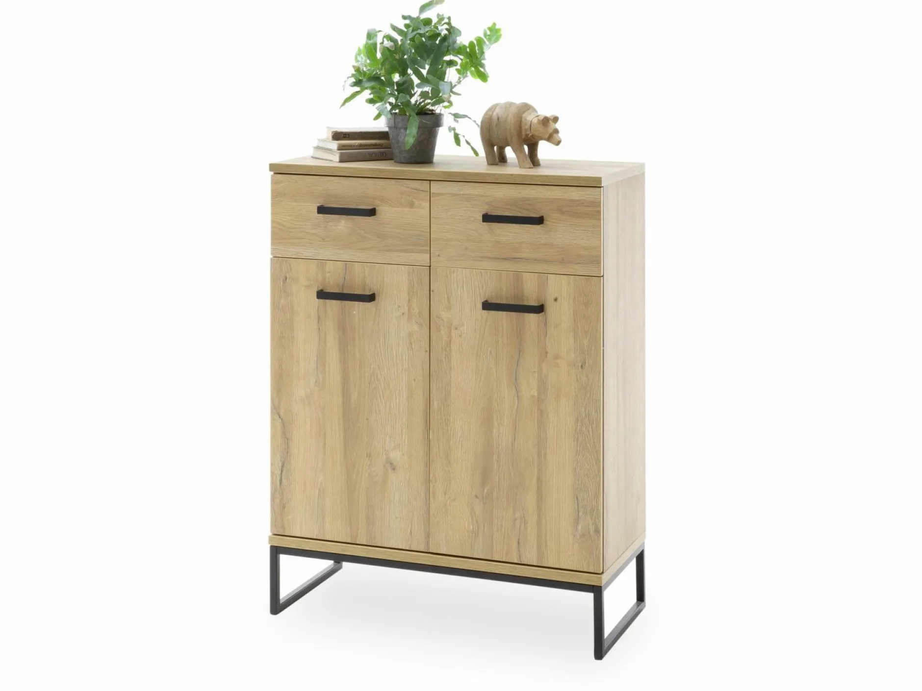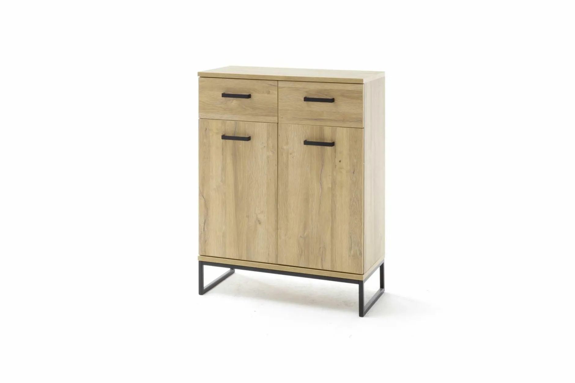 Geradliniges Design und viel nützlicher Stauraum – die Kommode Toledo von MCA überzeugt auf ganzer Linie! Der Korpus besteht aus einer Grandson Oak Melamin Nachbildung, das Gestell und die Griffe sind aus schwarzem Metall gefertigt. Durch den hell-dunklen Kontrast wirkt die Kommode sehr elegant und modern – sie wird zum Hingucker in Ihrem Wohnraum. Hinter den beiden Türen und in den beiden Schubladen können Sie diverse Gegenstände angenehm verstauen und auch für Dekorationsobjekte ist auf der oberen Ablagefläche Platz. Dank diesem Möbelstück wird eine schöne Atmosphäre in Ihrem Raum entstehen!a