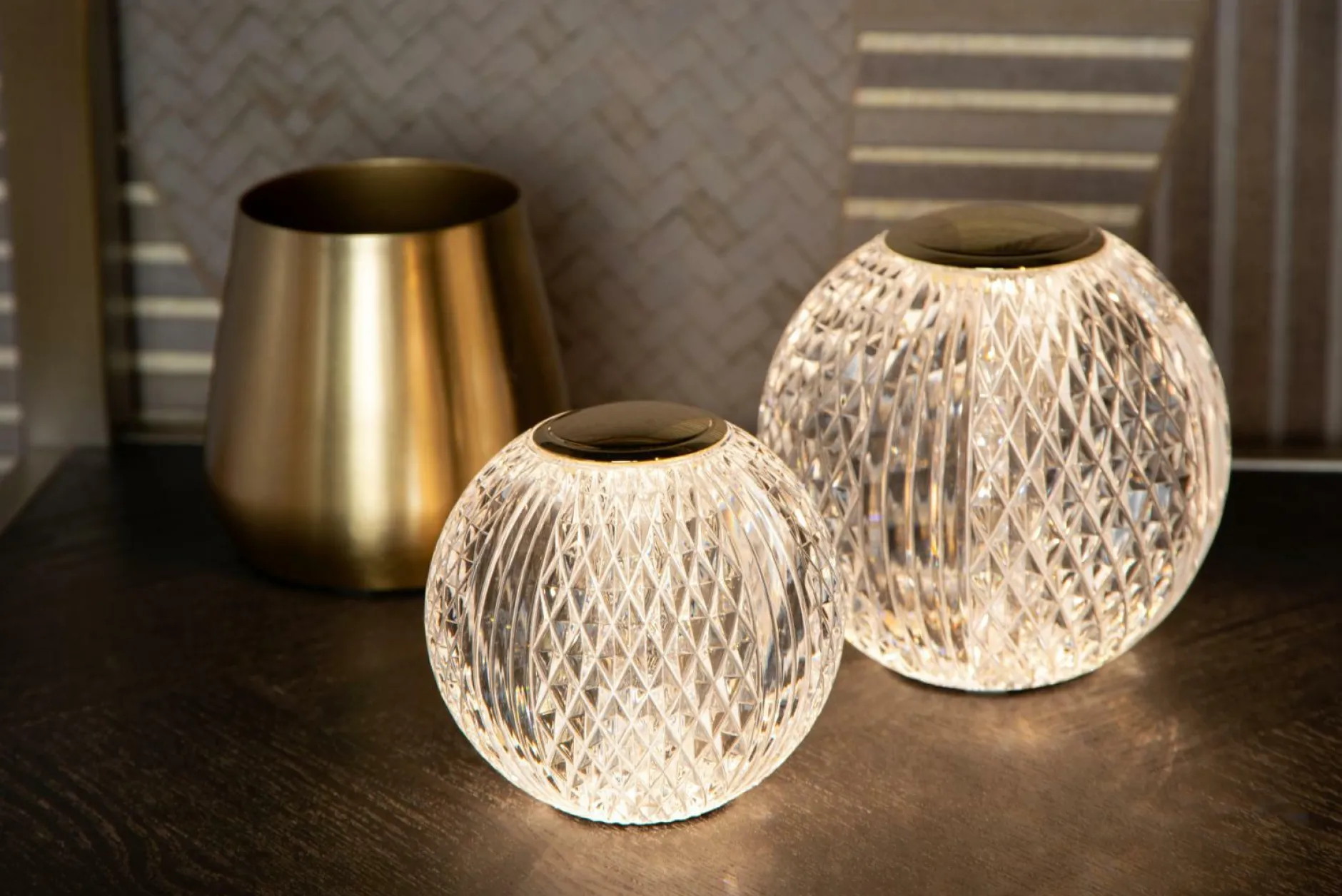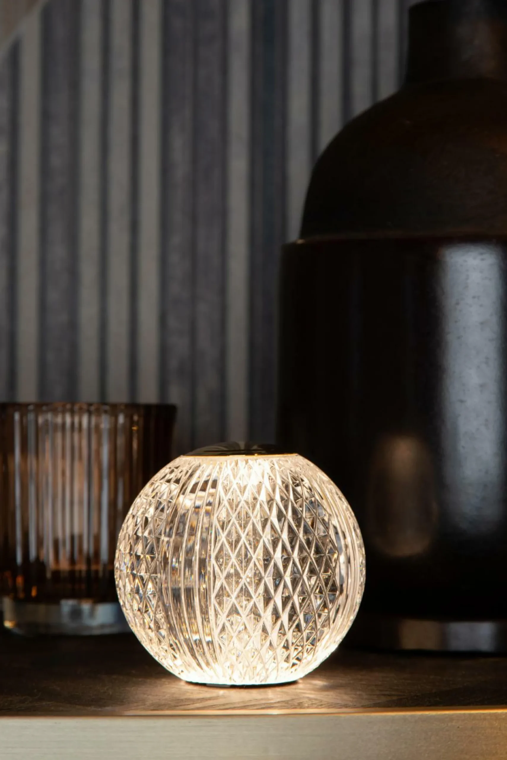· Mit der richtigen Stimmungsbeleuchtung bringen Sie das ganze Jahr über Freude in Ihr Zuhause. Cintra sorgt mühelos für bis zu 32 Stunden Lichtvergnügen, wo immer Sie es wünschen. Bewegen Sie diese batteriebetriebene Tischlampe mühelos durch Ihr Zuhause und stellen Sie sie auf Ihren Ess- oder Couchtisch, Ihre Kommode oder Ihren Nachttisch. Die transparente Kugel weist verspielte Rillen auf, die an Kristall erinnern. Dimmen Sie die integrierte LED-Lampe für ein optimales Ambiente. Cintra hat einen Durchmesser von 11 Zentimetern. Kombinieren Sie diese Tischlampe mit Accessoires aus Messing und verleihen Sie Ihrer Einrichtung einen zusätzlichen Hauch von Gemütlichkeit.