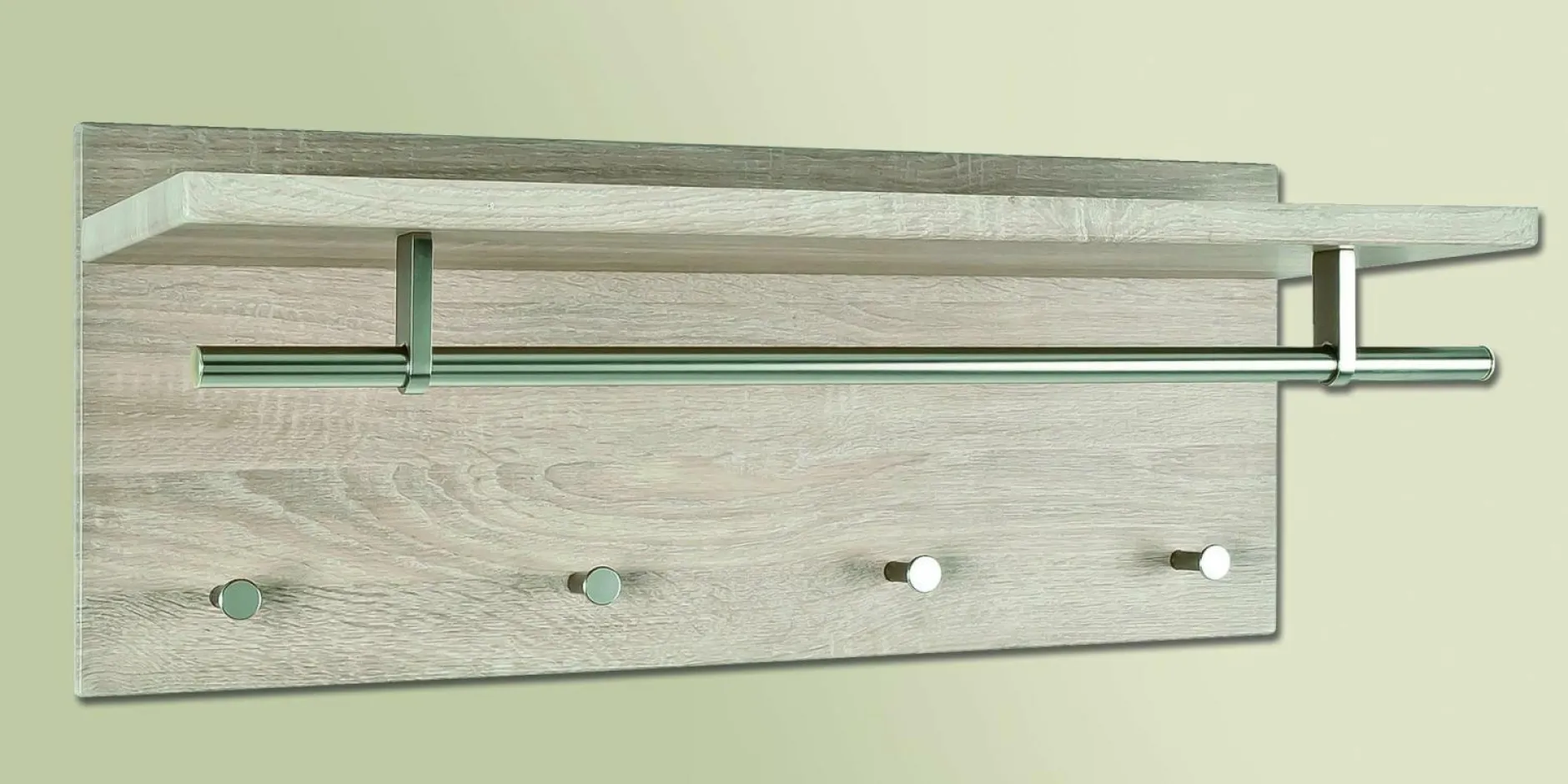 Diese Garderobe besteht aus MDF mit einer Kunststoffoberfläche in Eiche. Die Garderobenstange und die Knöpfe kommen in einer ansprechenden Edelstahloptik. Das schlichte Design lässt sich zu vielen Elementen kombinieren und ist ein nützlicher Helfer in jeder Einrichtung.