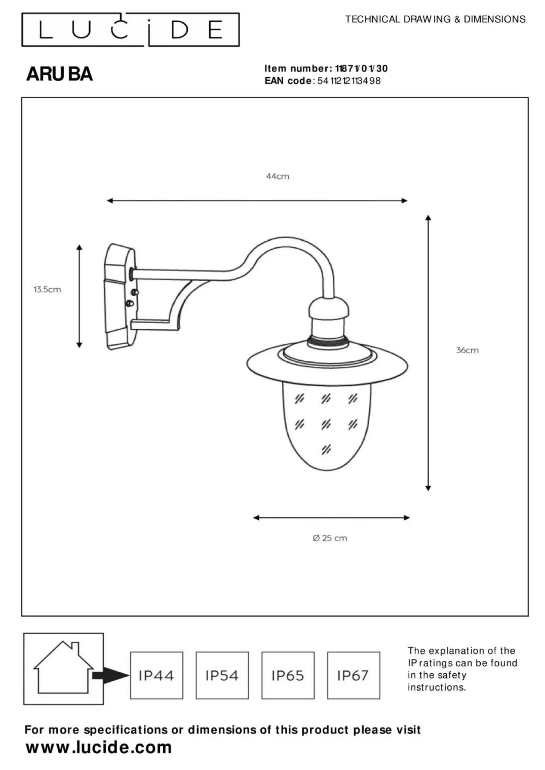 In Ihren Innenausstattungen sorgt die Wandleuchte ARUBA für ein gemütliches Ambiente und verwöhnt Sie ganz nebenbei mit einem stimmungsvollen Licht. Die Wandlampe präsentiert sich in einem hervorragenden Design und integriert sich wirkungsvoll in Ihr Zimmer. Alle Qualitäten und Besonderheiten der Marke LUCiDE kommen in dieser Wandleuchte zusammen. Das Modell ARUBA hat eine Dimmfunktion, die für eine angenehme Wohlfühlstimmung sorgt. Es ist mit der Schutzart IP44 ausgestattet und deswegen vor Eindringen fester Fremdkörper mit einem Durchmesser größer als 1 mm und Spritzwasser geschützt. Die Wandleuchte im ländlichen Design weist eine Gesamtbreite von 44 cm, eine Länge von 25 cm und eine Höhe von 36 cm auf. Das Modell ARUBA kann sich hervorragend in Ihr Zimmer einfügen und schafft dort ein gemütliches Flair. Es ist mit einer E27-Fassung versehen. Die Lampe aus Metall eignet sich perfekt für eine tolle Beleuchtung und verleiht Ihrem Zimmer das gewisse Etwas. Für Ihr Lichtkonzept ist die Wandleuchte ARUBA genau das passende Accessoire.