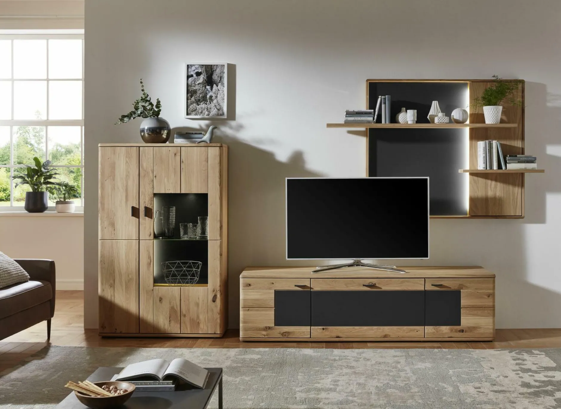Lassen Sie Ihr Wohnzimmer in einem modernen und gleichzeitig wohnlichen Design erstrahlen mit der Wohnwand Faith aus dem Hause vito. Das Set besteht aus einem Highboard, einem Lowboard und einem Wandregal, die Wohnwand bietet daher ausreichend Verstaumöglichkeiten für Ihre persönlichen Dinge. Die Korpusse innen ist aus Alteiche Dekor und werden von dem Korpus außen aus furnierter Alteiche Bianco ergänzt. Die Fronten aus massiver Alteiche Bianco werden von den Frontakzenten aus Grauglas akzentuiert. Die sichtbaren Rückwände in Grauglas-Optik runden das Design perfekt ab. Die Vitrine ist mit Parsolglas ausgestattet. Alle Schubkästen sind mit Selbsteinzug und Dämpfung. Auf Wunsch ist Beleuchtung erhältlich. (1×10 cm Typenabstand)