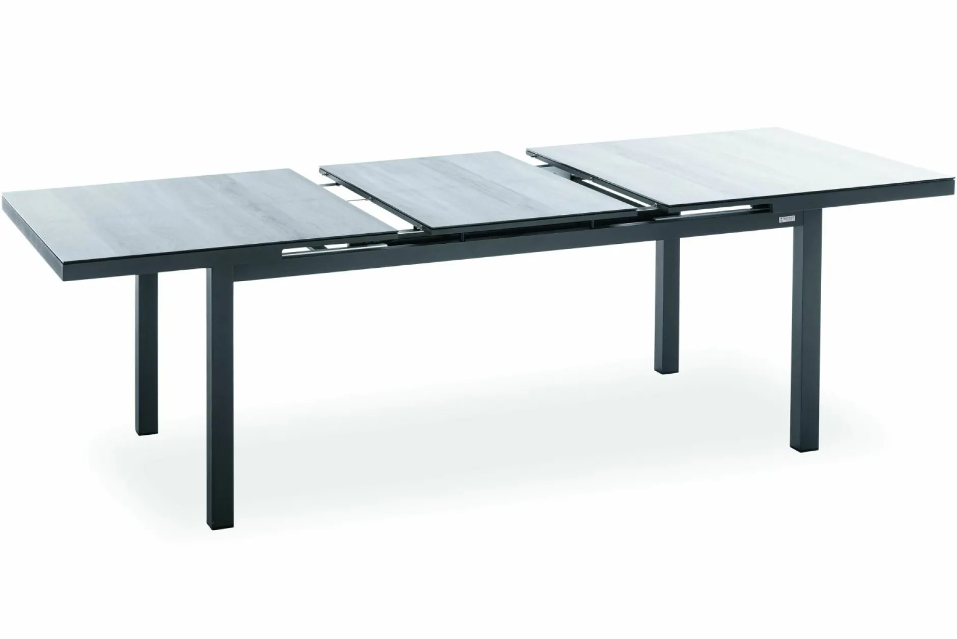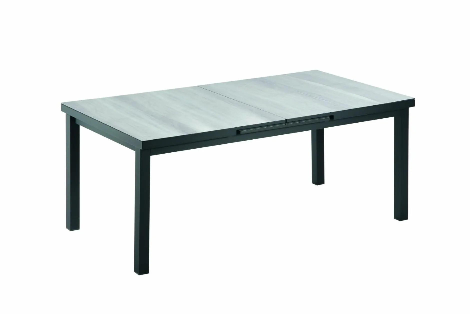 · Ausziehtisch NANCER Tischplatte mit Glasauflage Holzoptik grau mit 2(3) Segmenten, Synchronauszug 60 cm, Gestell Aluminium pulverbeschichtet, Farbton anthrazit, 180(240)x100 / 76 cm
