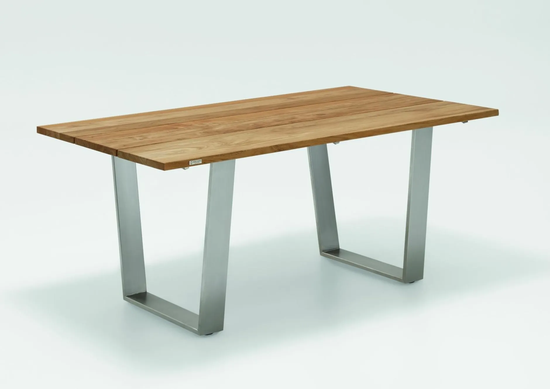 · Tisch NOAH Tischplatte Teak geölt, Gestell Trapezkufe Edelstahl gebürstet.