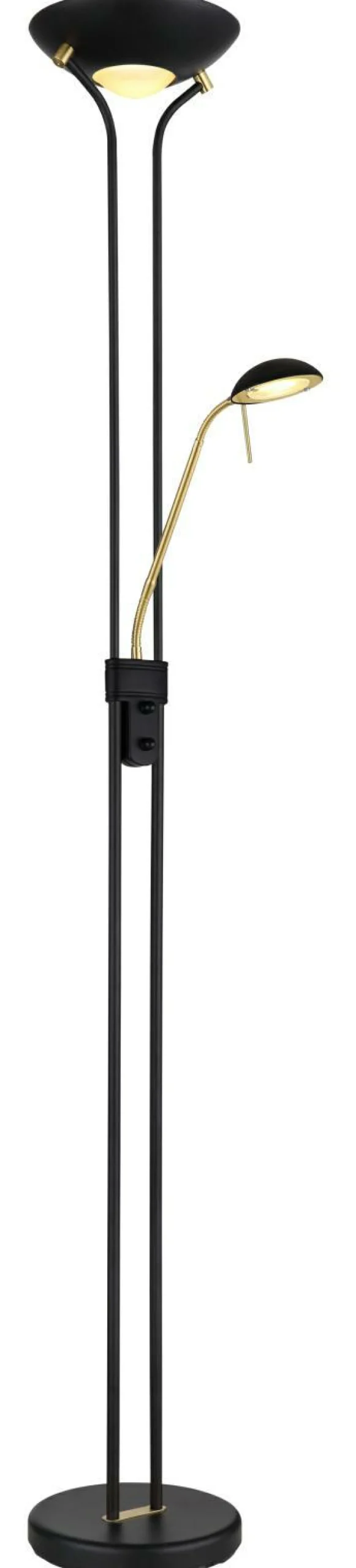 · Diese tolle Stehleuchte begeistert durch Ihr schönes Design in Messing und Schwarz. Aus einem Sockel in Messing (Ø25,5cm) ragen zwei parallel verlaufende schwarz matte Metallstangen, zu einem Glasschirm in 1,8m Höhe in Schwarz. In der Mitte der zwei parallel verlaufenden Metallstangen befindet sich ein flexo Gelenk in Messing mit integrierten LED Leuchtmittel. Diese Stehleuchte kann auch an diesen Punkt bei einer angenehmen Lichtstärke von 3000 Kelvin warmweiß, gedimmt werden.