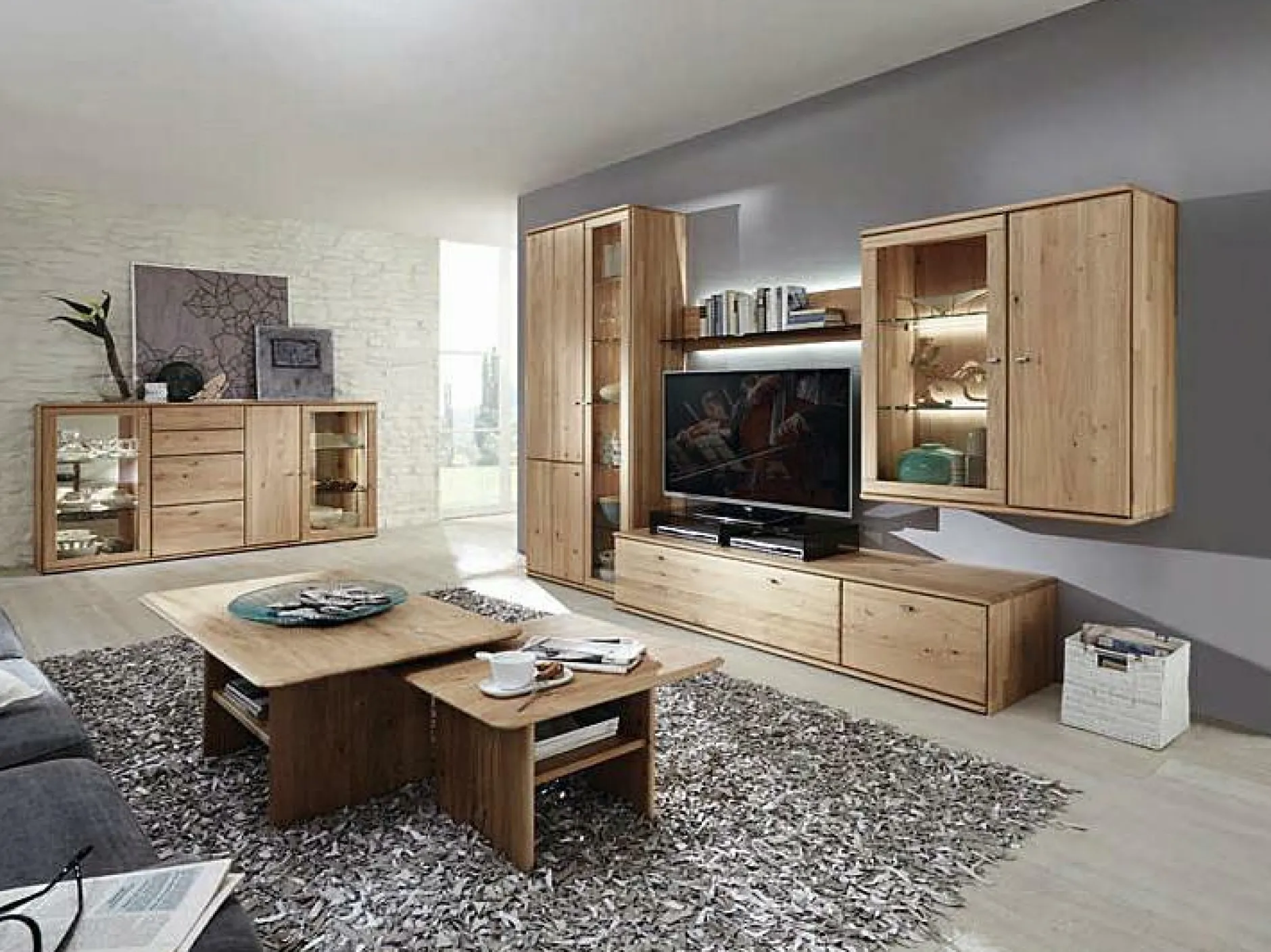 europ. Wildeiche massiv, soft gebürstet bestehend aus den Typen: 6074, Vitrine BHT 102,2/217,2/42,3 2 Holztüren li. / 1 Glastür re. 1053, Unterteil BHT 204,6/41,2/55,1 1 großer Auszug li. (2 Zargen) 1 kleiner Auszug re. 0140, L-Wandboard BHT 142,2/25,3/23,2 13077, Hängeelement BHT 102,2/110,8/42,3 1 Glastür li. / 1 Holztür re. >> Preis ohne Beleuchtung, Trafo, Funkdimmer und ohne TV-Glasaufsatz <<