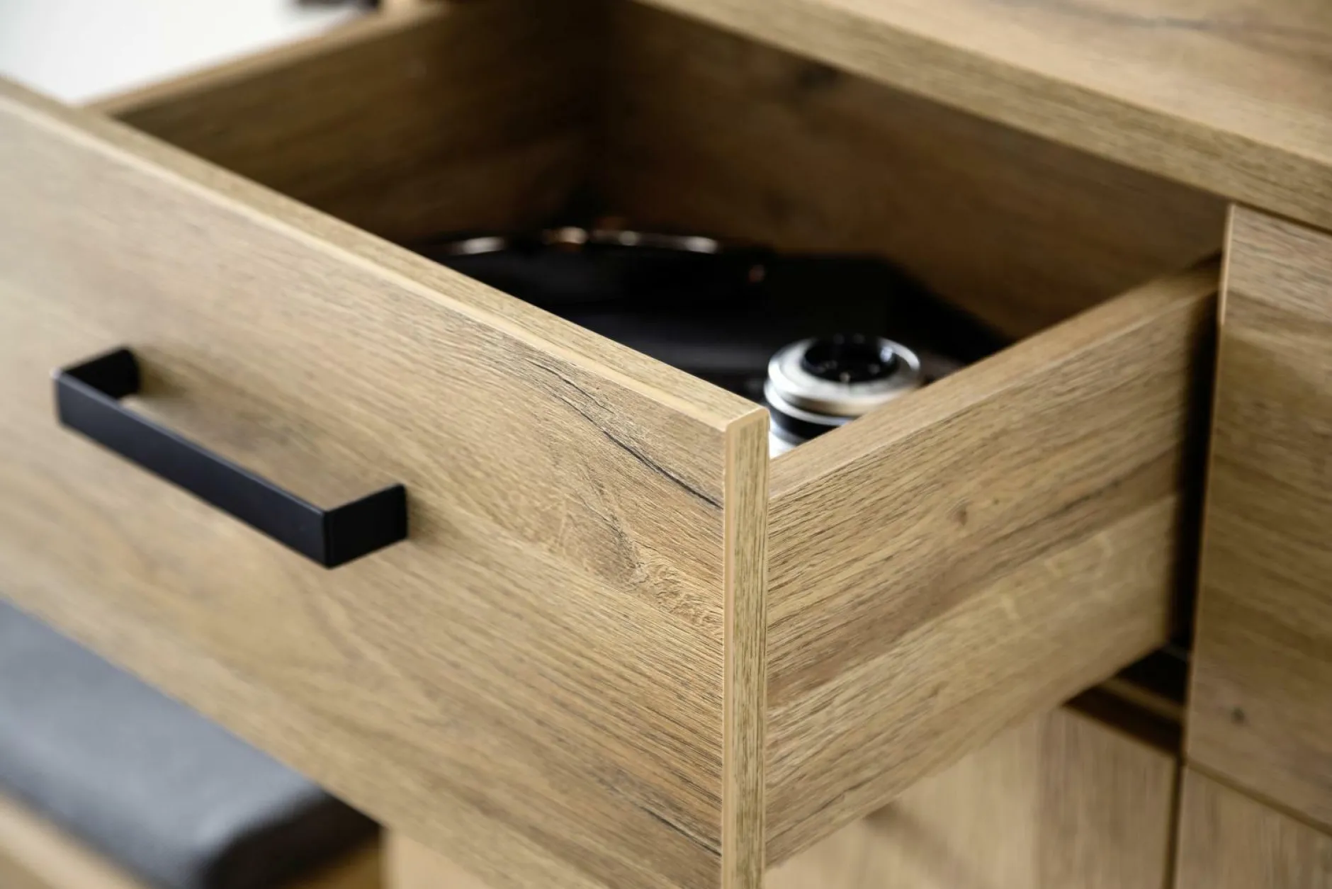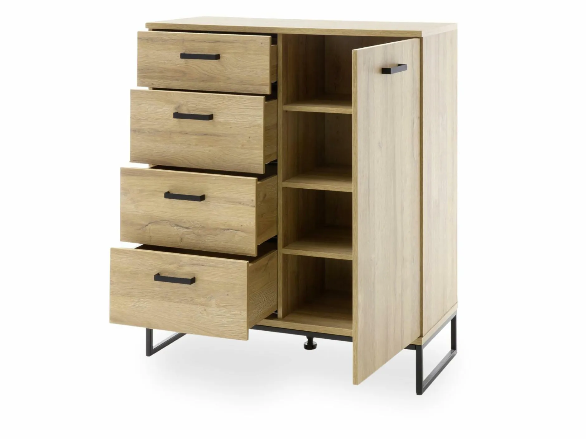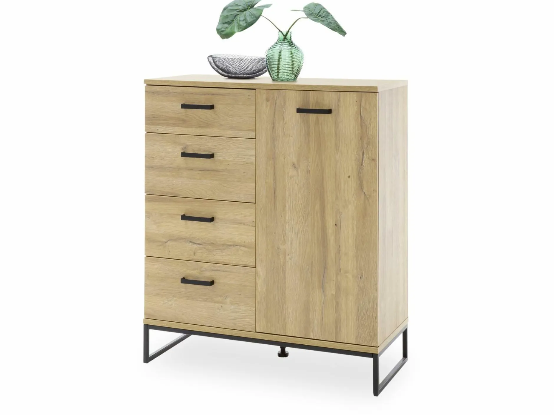 Geradliniges Design und viel nützlicher Stauraum – die Kommode Toledo von MCA überzeugt auf ganzer Linie! Der Korpus besteht aus einer Grandson Oak Melamin Nachbildung, das Gestell und die Griffe sind aus schwarzem Metall gefertigt. Durch den hell-dunklen Kontrast wirkt die Kommode sehr elegant und modern – sie wird zum Hingucker in Ihrem Wohnraum. Hinter der Tür und in den vier Schubladen können Sie diverse Gegenstände angenehm verstauen und auch für Dekorationsobjekte ist auf der oberen Ablagefläche Platz. Dank diesem Möbelstück wird eine schöne Atmosphäre in Ihrem Raum entstehen!