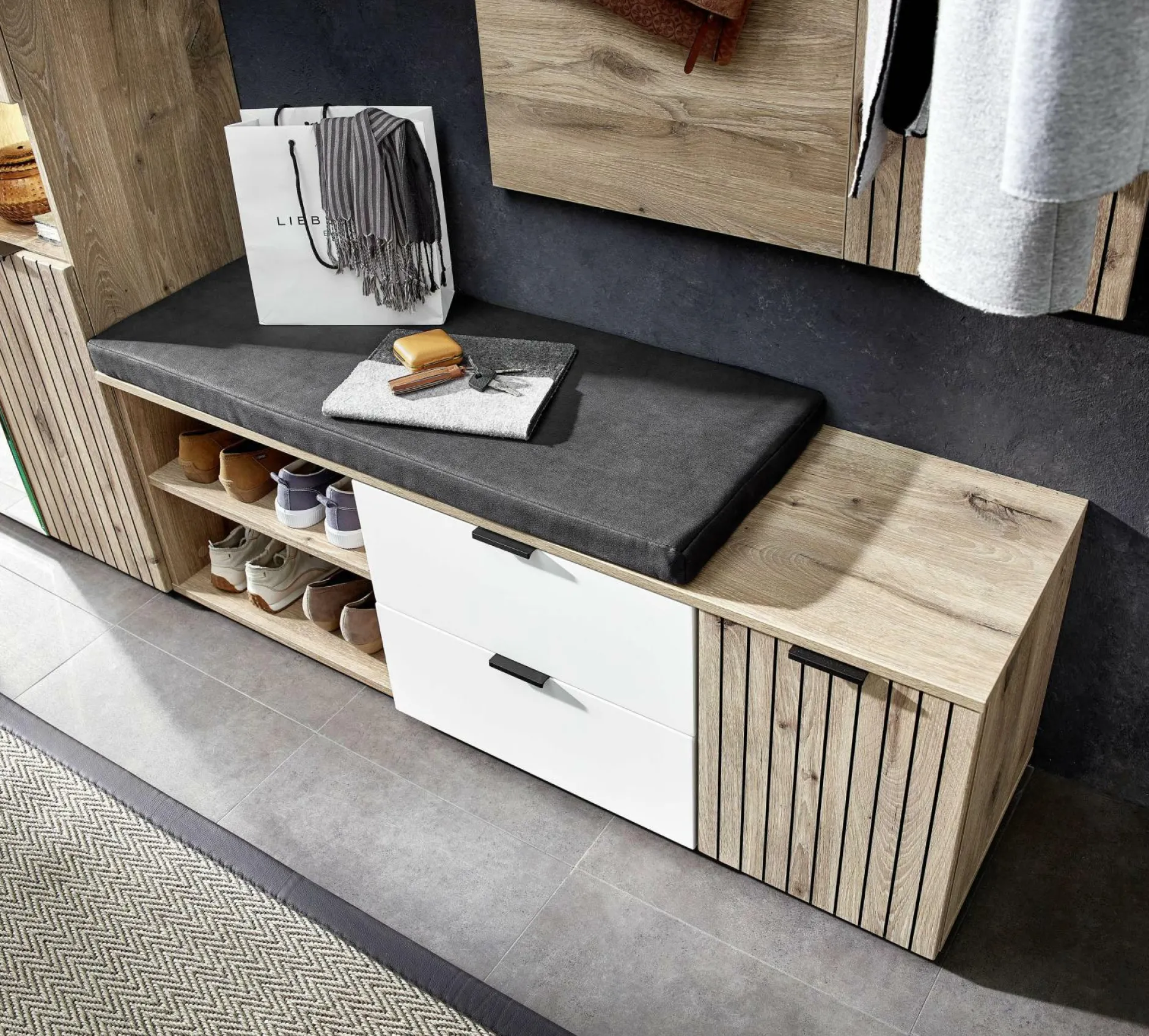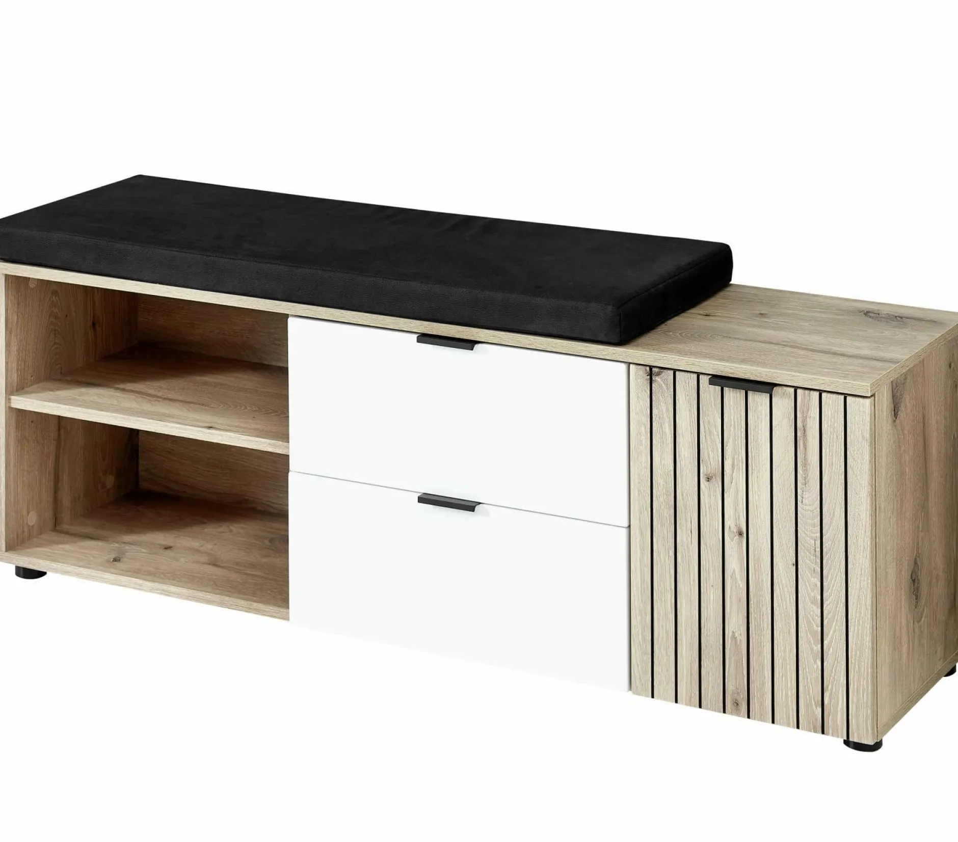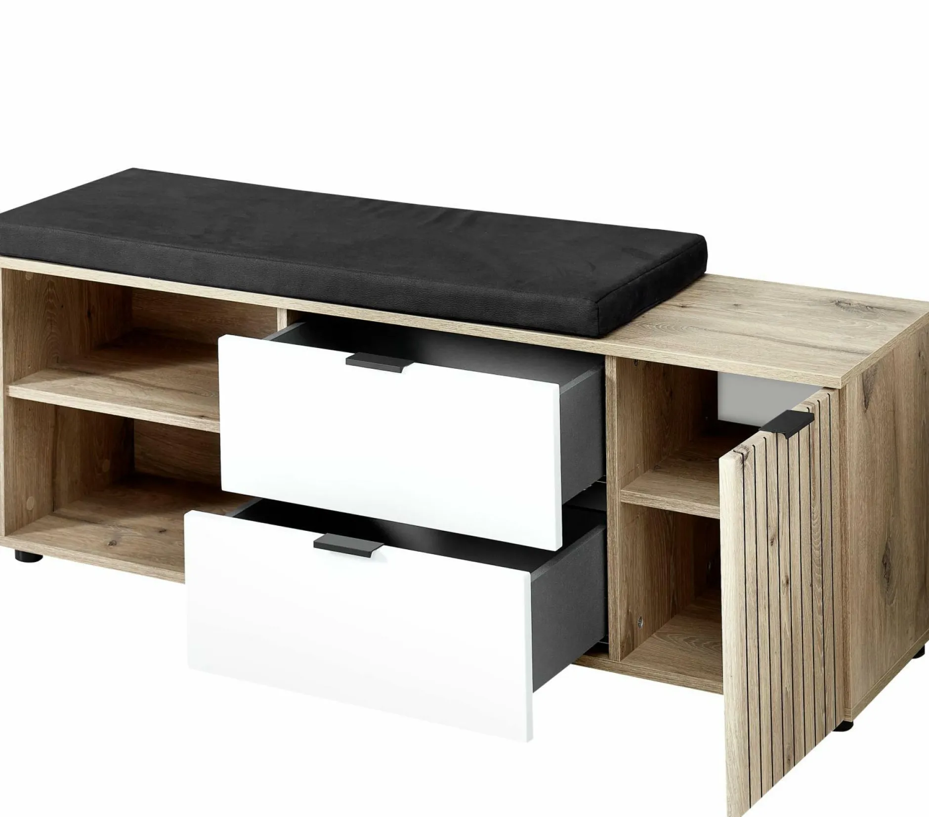 Entdecken Sie die vielseitige Bank der SENYO Garderobe von vito. Die Front und der Korpus aus Eichen Nachbildung verleihen dem Ganzen eine natürliche Ästhetik, während die Akzente in Leistenoptik den Stil optimal ergänzen. Mit einer Tür, zwei offenen Fächern und zwei Schubkästen bietet sie praktischen Stauraum. Die mittigen Schubladen setzen sich durch die weiß matte Front von dem Rest ab. Zwei Einlegeböden ergänzen die Funktionalität und schaffen Ordnung. Das inkludierte Sitzkissen in anthrazitfarbener Lederoptik sorgt für Komfort und Stil. Entdecken Sie das gesamte SENYO Garderobensystem von vito und kombinieren Sie die Möbelstücke nach Ihren Vorstellungen für ein einheitliches Gesamtbild.