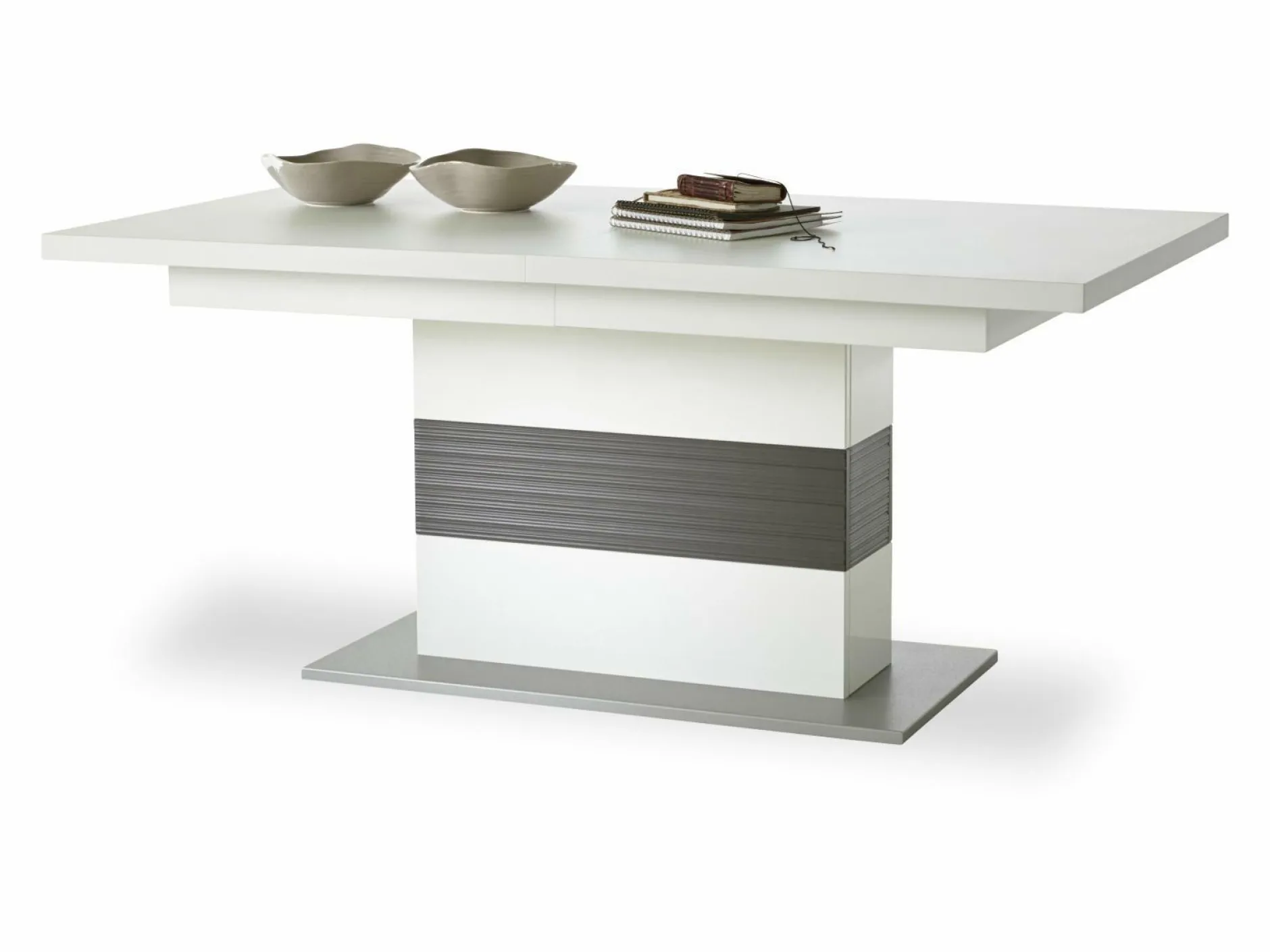 Der Esstisch Marlon besitzt ein zeitloses, modernes Design, dass in viele Einrichtungsstile integrierbar ist. Bei diesem Tisch besteht die Tischplatte aus einer weißen Melamin-Nachbildung, die Bodenplatte aus einer grauen Melamin-Nachbildung und die Säule aus einer weißen Melamin-Nachbildung mit Absetzungen in einer grauen 3D-Optik. Durch seine markante Form und das spezielle Gestell wird der Esstisch in Ihrem Esszimmer zum Hingucker. Dabei ist der 180 cm breite Tisch mit einem Synchronauszug ausgestattet, sodass Sie ihn durch zwei Einlegeplatten auf 280 cm ausziehen können. Nehmen Sie mit Ihren Liebsten Platz und genießen Sie leckere Mahlzeiten!
