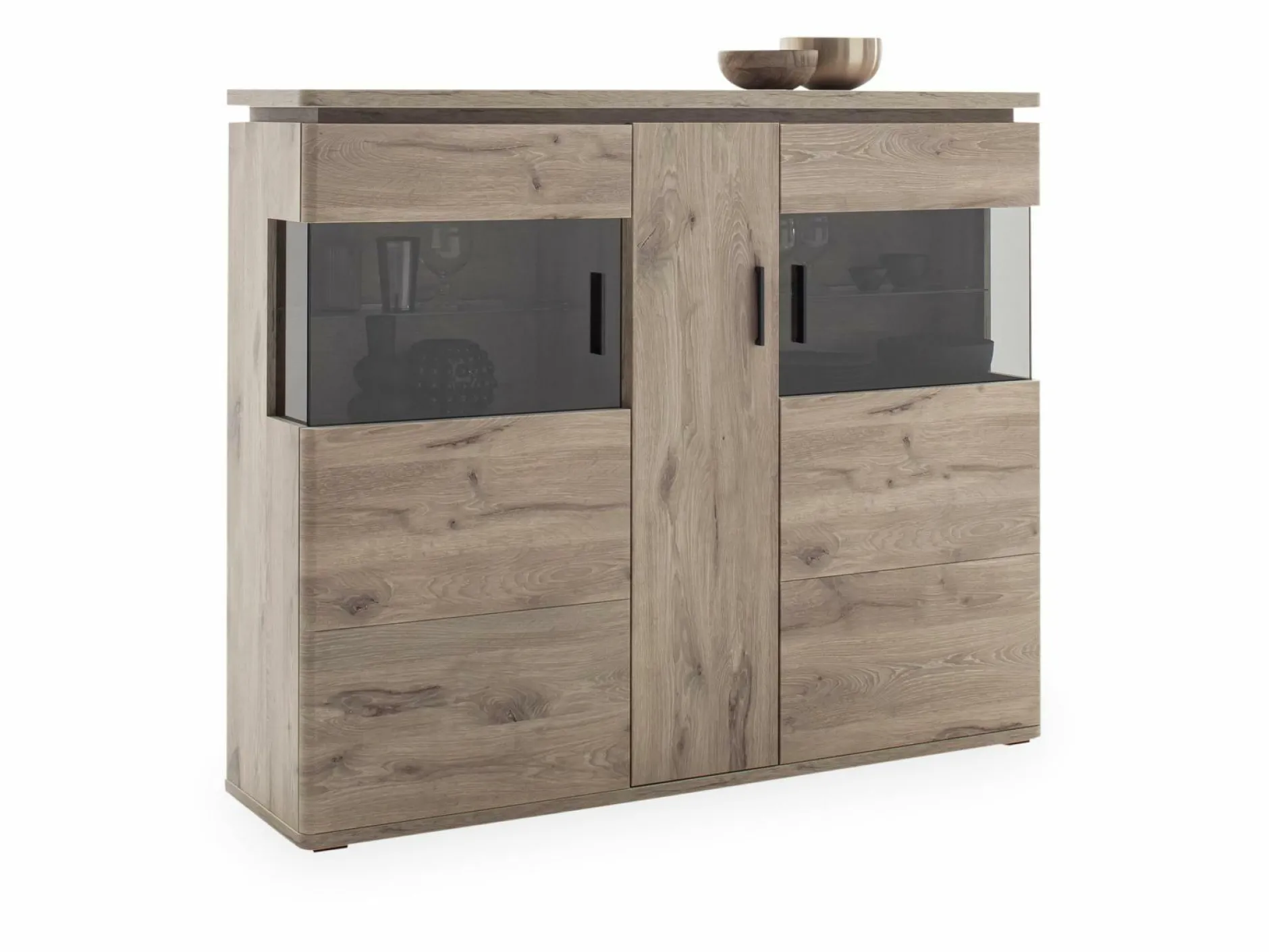 Das Highboard MARSEILLE der Trendmarke HARPER überzeugt mit einem modernen und zugleich zeitlosen Design und einer vielseitigen Stauraumlösung. Das Highboard verfügt über eine Holztür und zwei Glastüren aus grauem Parsolglas mit edler Seitenverglasung und anthrazitfarbigen Metallgriffen. Der Korpus und die Front erscheinen in robustem Dekor in der Ausführung Viking Oak. Die innenliegenden Böden sind aus Viking Oak Dekor gefertigt, die sichtbaren Glasböden erscheinen in hochwertigem Klarglas. Die sichtbare Rückwand begeistert in der Ausführung Viking Oak Dekor in sandgestrahlter 3D Eichenholzoptik. Eine stimmungsvolle LED Beleuchtung des Oberbodens ist inklusive. Auf Wunsch sind weitere Beleuchtungsmöglichkeiten und eine Funkfernbedienung erhältlich.