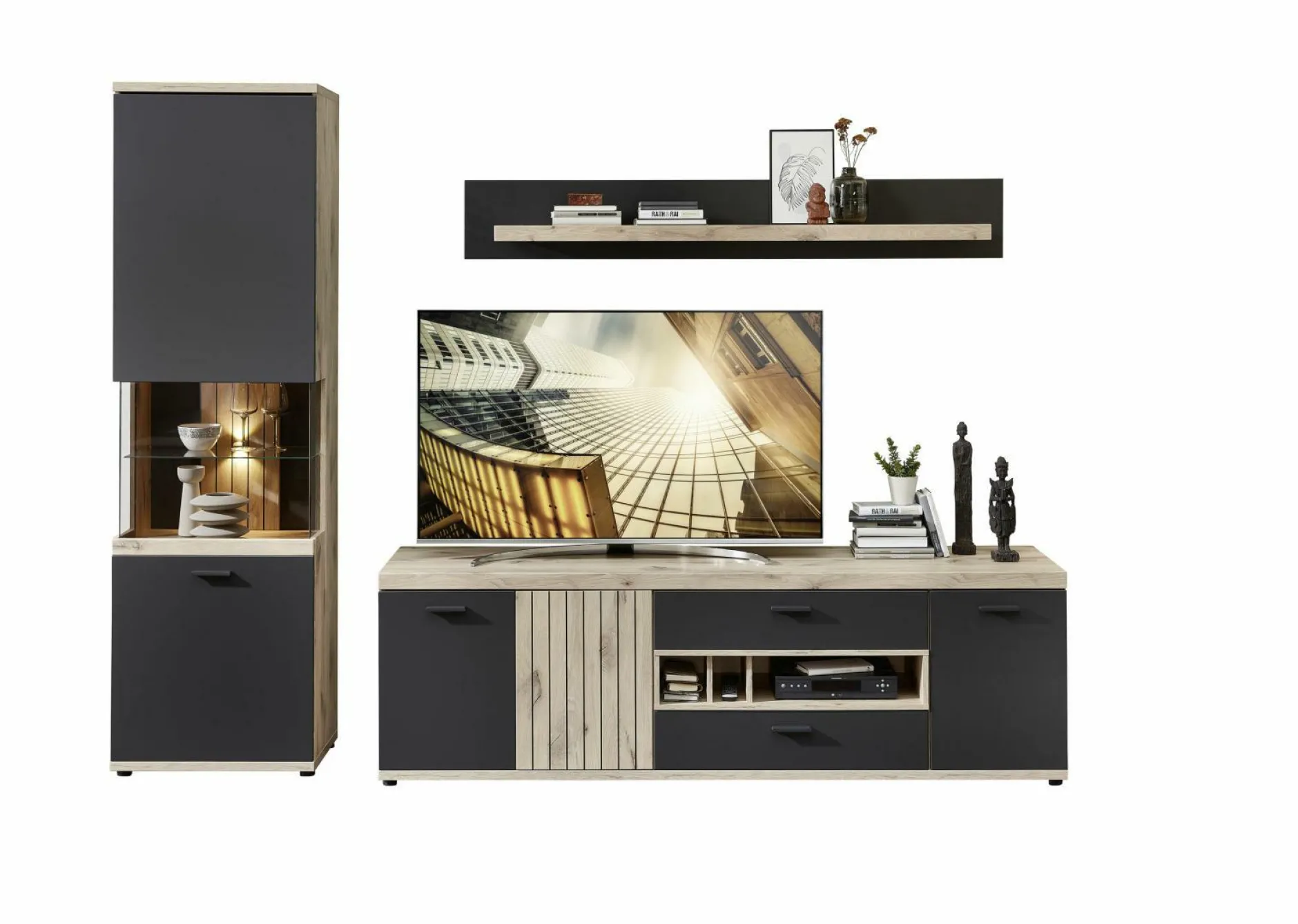 · Bestehend aus: Vitrine mit 1 Tür links, Wandbord und Lowboard mit 3 Türen, 2 Schub- kästen und 3 offenen Fächern