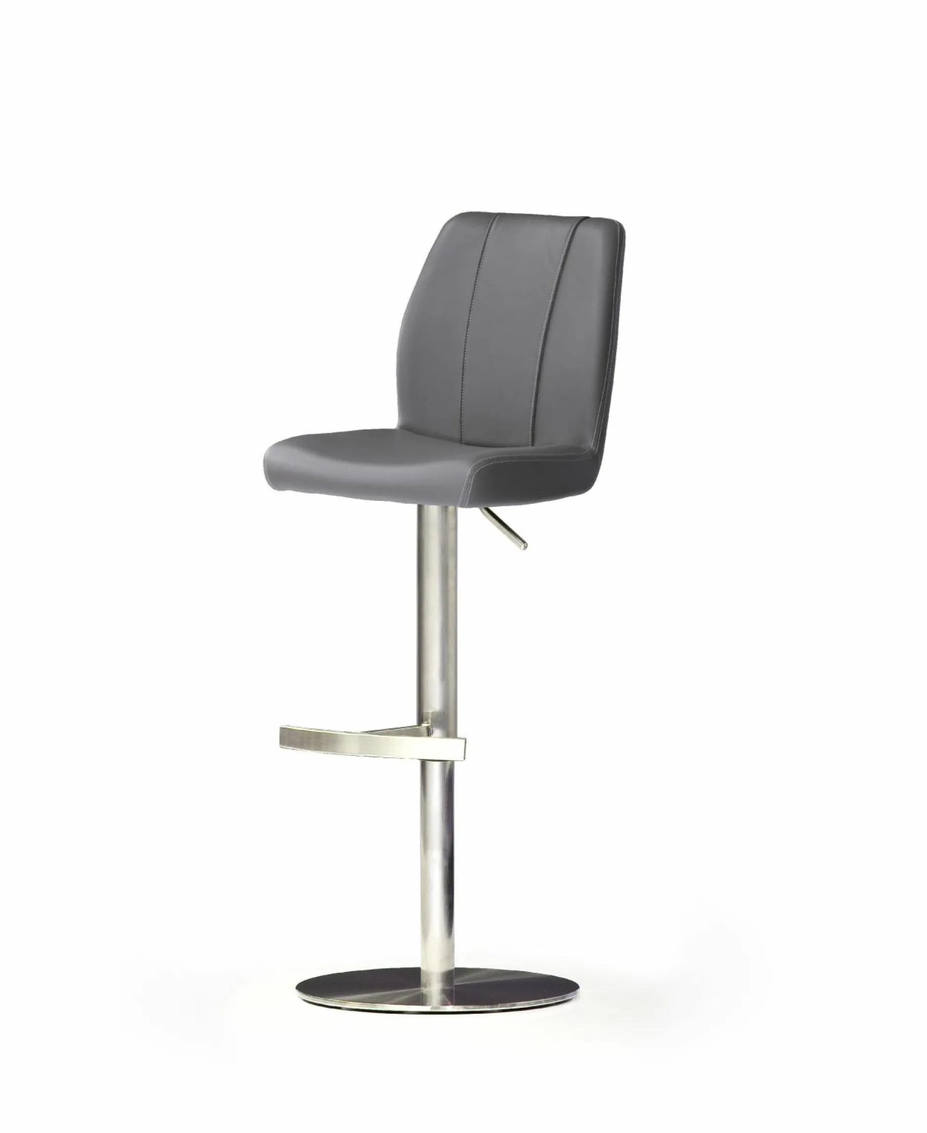 Top modern und höchst bequem präsentiert sich der Barhocker in einem grauen Lederlook. Der Barstuhl mit einem runden Edelstahlgestell lässt sich in der Höhe zwischen 89 und 114 cm verstellen. Ein Tellerfuß mit eckiger Liftsäule und Fußstütze rundet das attraktive Design des Hockers ab.