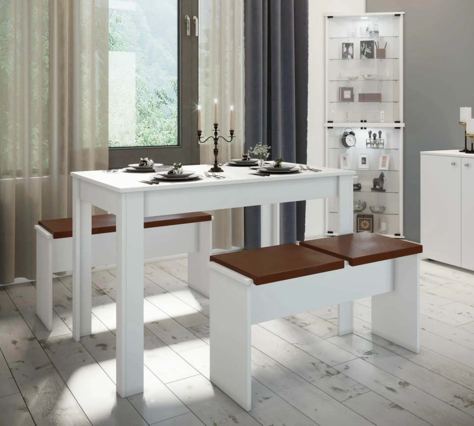 · Das Möbel-Set ist nicht nur ein Blickfang, sondern auch ein sehr cleveres Funktionsmöbel, da die Tischbänke platzsparend unter dem Tisch verstaut werden können.