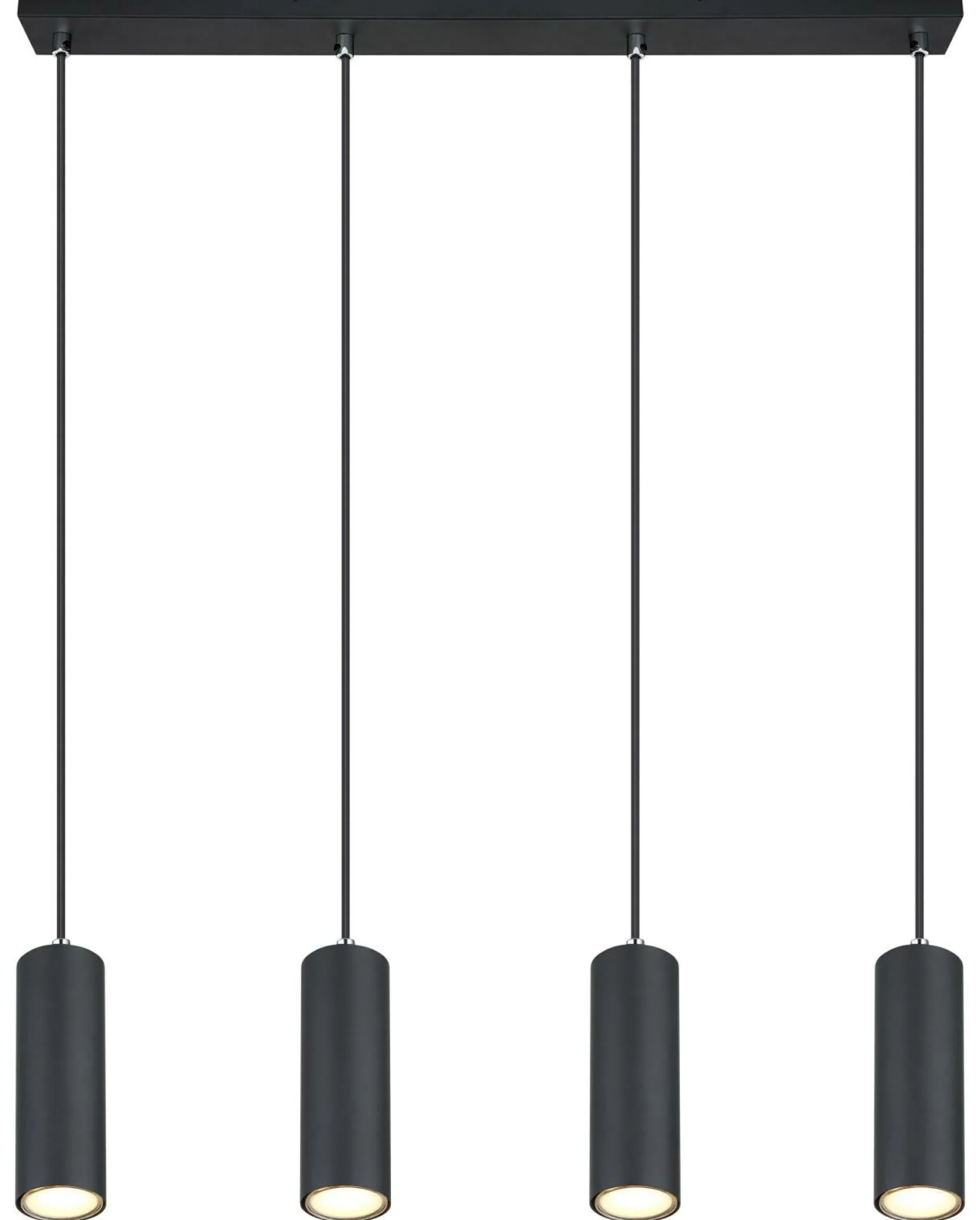 · Diese wunderschöne Hängeleuchte der Robby Serie in Schwarz begeistert durch schlichtes Design. An einer 65cm langen Deckenbefestigung verlaufen 4 Kabel zu je einer GU10 Fassung. Die Gu10 Fassungen ermöglichen Ihnen selbst über Lichtfarbe und Helligkeit, bis zu einer maximalen Leistung von 35 Watt, zu bestimmen. Mit weiteren Modellen dieser Serie können Sie Ihren Wohnbereich wundervoll ergänzen.