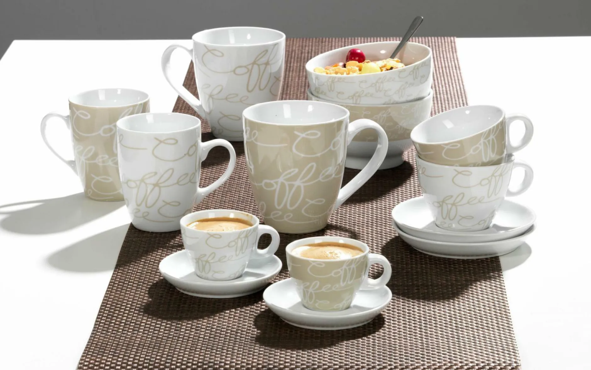 Mit der Jumbotasse Cornello von Ritzenhoff + Breker gut in den Tag starten. Die cremefarbene Tasse aus Porzellan ist mit schicken Coffee-Schriftzügen versehen und setzt so schöne Akzente. Die Tasse mit einem Fassungsvermögen von 600 ml ist ein praktischer Behälter für Tee, Kaffee und weitere Heißgetränke.