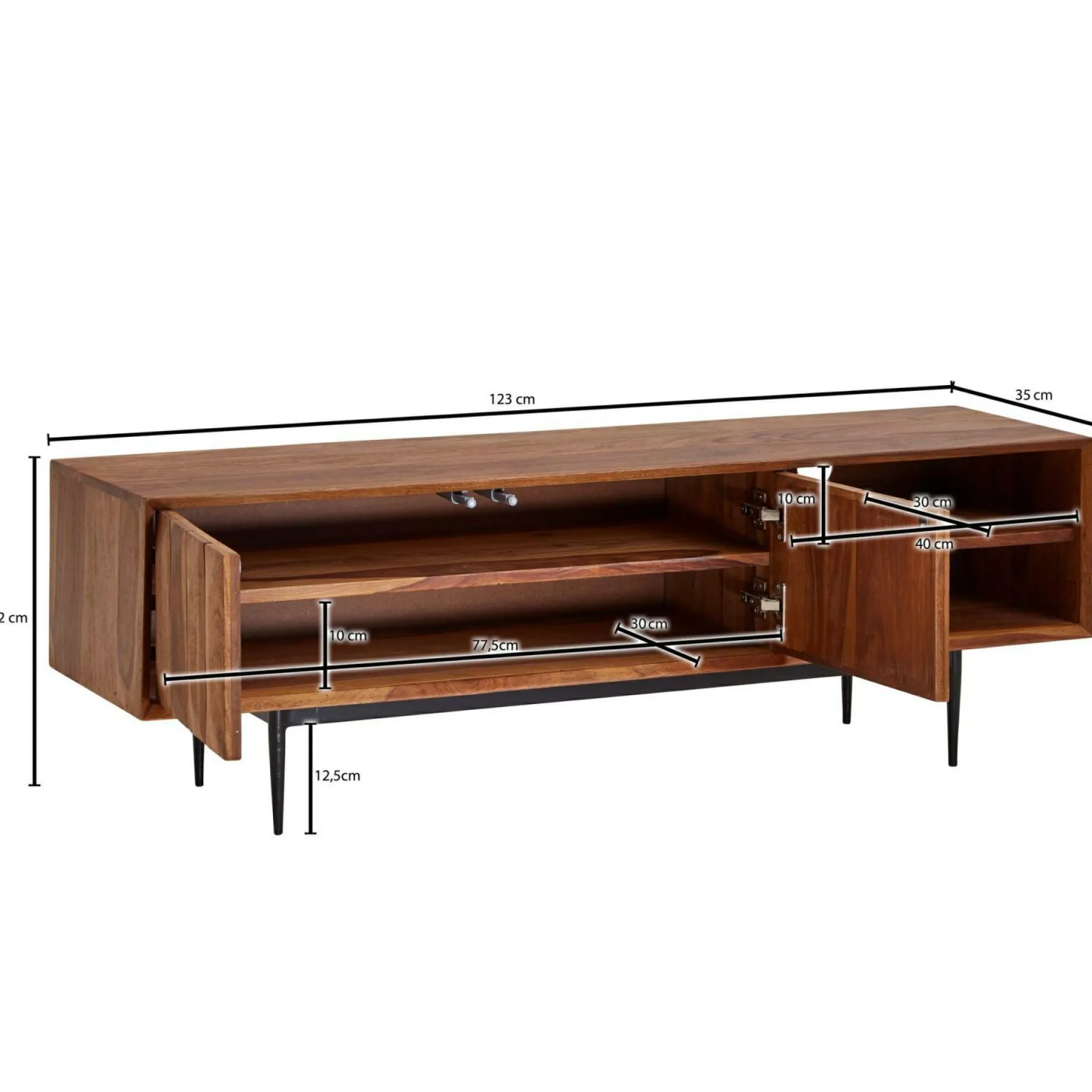 · Abmessungen – Innenmaße je Türfach (BxHxT): 77,5 x 10 x 30 cm, Innenmaße je offenem Ablagefach (BxHxT): 40 x 10 x 30cm.