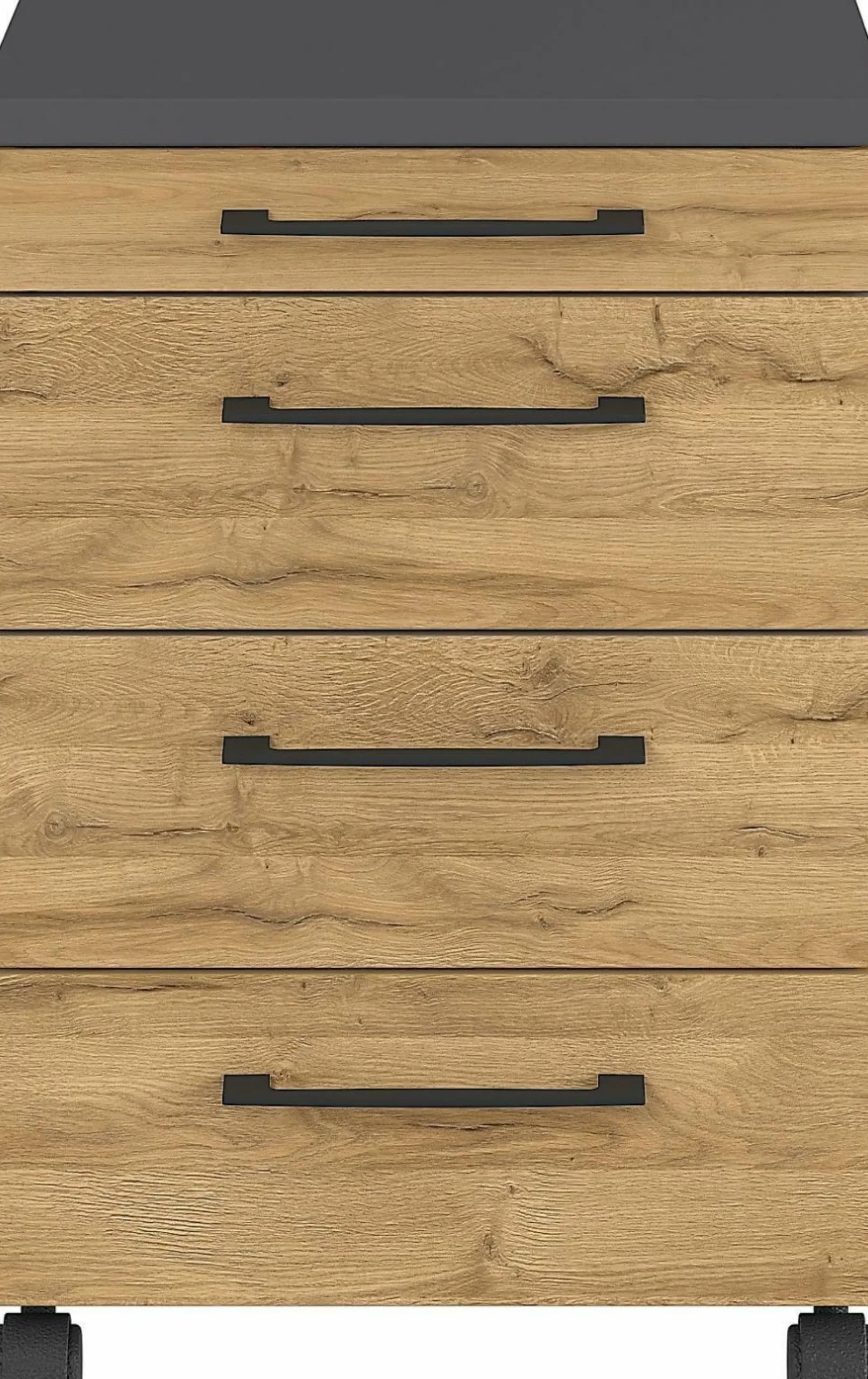 · Rollcontainer mit vier Schubladen, oberste Schublade (belastbar bis zu 1 kg) mit Utensilienfach, restliche Schubladen jeweils belastbar bis zu 10 kg, Oberboden belastbar bis zu 20 kg, vier Bügelgriffe aus Metall in Schwarz, vier schwarze Laufrollen aus Kunststoff, zwei davon feststellbar, Melaminharzbeschichtung, ABS-Kanten, Made in Germany.