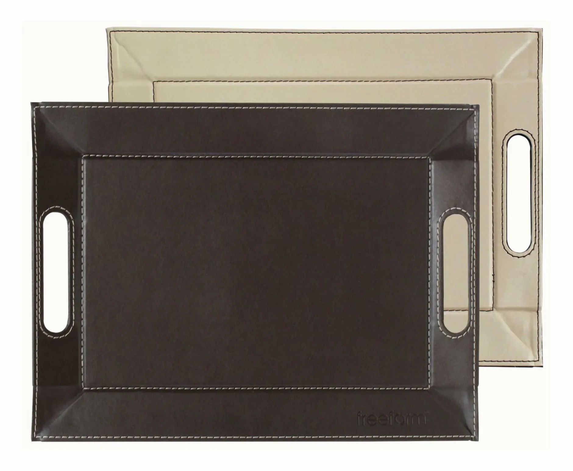 Das Tablett FREEFORM in Braun/Creme ist ein praktisches Element für den Alltag. Das schicke Tablett aus Kunstleder hat zwei farbige Seiten und sorgt dadurch für geschmackvolle und schicke Akzente im Wohn- und Essbereich. Stilvoll können darauf die verschiedensten Gerichte gebracht werden.