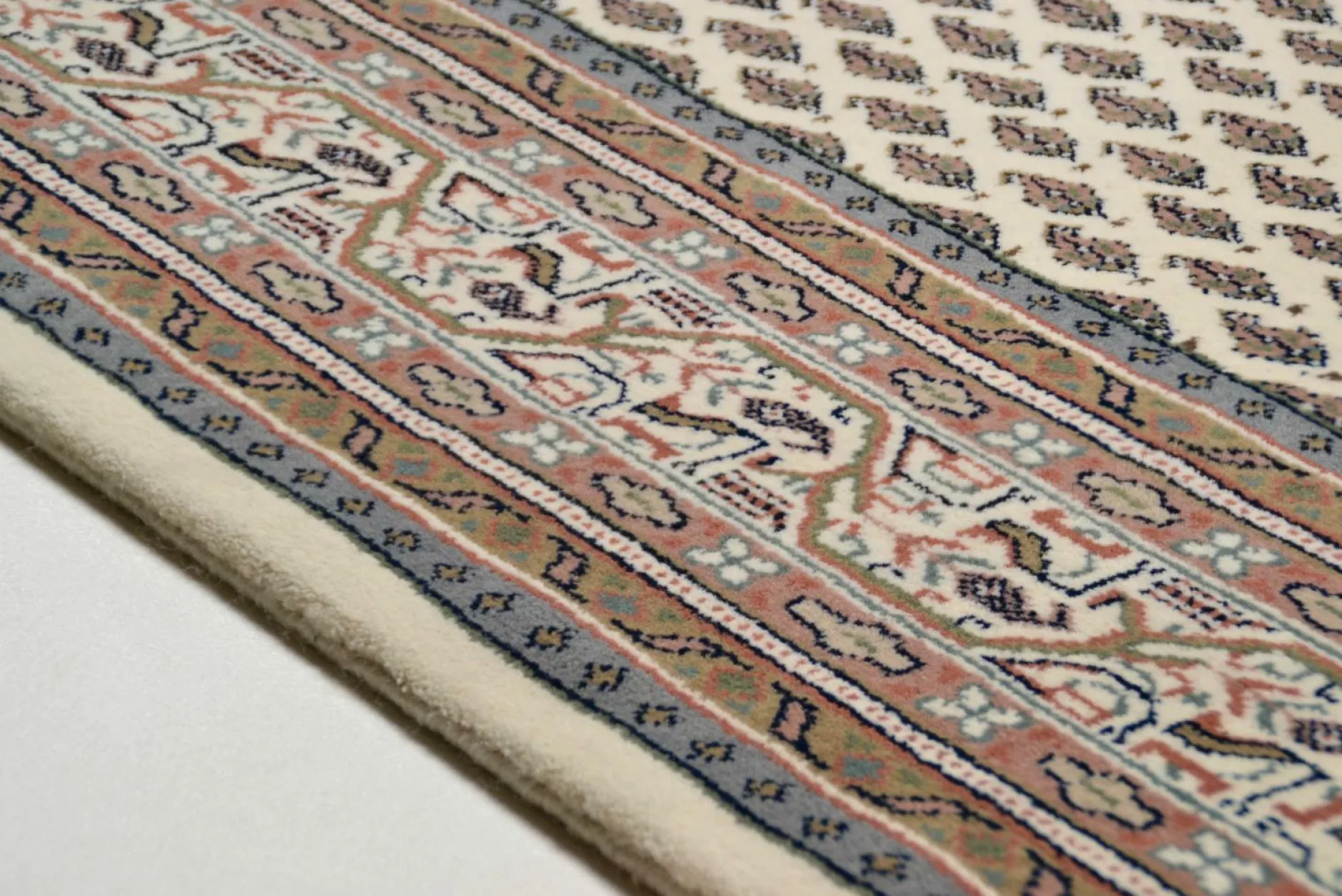 · Das »Mir- Muster« gehört zu den traditionellen Mustern des Orients. Es ist ein gleichbleibendes, sich wiederholendes Feldmuster das seinen Ursprung in Westpersien hat. Die zeitlose Eleganz dieser Teppiche ist aktueller den je. Ein Mir passt ideal zu einer klassischen sowie zu einer modernen Einrichtung und ist die perfekte Bereicherung für den Aktuellen Vintage Look. Die Qualität “Abbas steht für einen hochwertigen handgeknüpften Teppich aus Indien. Der Flor besteht aus reiner Schurwolle, die zu einem feinen Kammgarn versponnen wurde. Die Orientteppiche der Qualität Abbas überzeugt durch ihre Verarbeitung und Qualität bei ca. 210.000 Knoten per m² und einer Gesamthöhe von 12mm. Durch die enge Knüpfeinstellung und des daraus entstehenden dichten Flor, wird die Darstellung des Musters in Perfektion wiedergegeben. Der Orient-Teppich ist eine Bereicherung für jeden Wohnraum und hat heute noch einen sehr hohen Stellenwert. Ein Handgeknüpfter Teppich ist einzigartig und muss als Kunstwerk betrachtet werden. Die Kunsthandwerk wird von Generation zu Generation weitergegeben und macht jeden Teppich zu was besonderem. Der Handgefertigte Orient-Teppich zeigt leichte Unterschiede in Größe, Farbe und eindeutige Anzeichen für ein Teppich als Kunstwerk. Edelste Garne, verknüpft nach Jahrhunderte alter Tradition, verleihen den Teppichen der THEKO® classic Kollektion eine ganz besondere Ausstrahlung. Ein Stück Tradition und Zeitlosigkeit, in einer immer schnelllebiger werdenden Welt verbirgt sich hinter der Marke ?THEKO classic?. Designs und Qualitäten mit tiefem geschichtlichem Hintergrund, die sich über Jahrhunderte bewährt haben. Sie werden immer noch nach traditionellen Methoden gefertigt und haben einen ganz besonderen Reiz der Nomadenkultur.