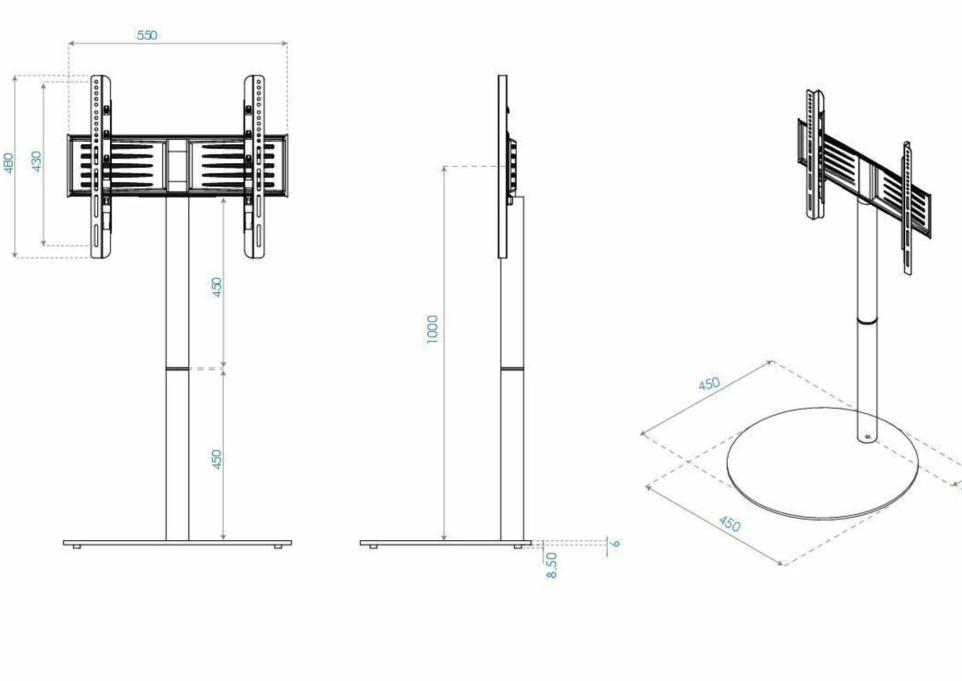 · VCM TV-Standfuß “Cirla“ ohne Zwischenboden. Stabiles Standrohr aus Stahl. Halterung um 60 Grad schwenkbar für LED / LCD / PLASMA TV-Geräte von 26-70 Zoll (66-177 cm) bis maximal 40 kg. VESA-Kompatibel mit 200×100 bis 400×400 mm. Verdeckte Kabelführung im Standrohr. Der Boden besteht aus einer stabilen Stahlplatte und sorgt für eine hohe Stabilität. Maße der Bodenplatte: B 45 cm, T 45 cm. Produktmaße: Höhe 100 x Breite 55 x Tiefe 45 cm.