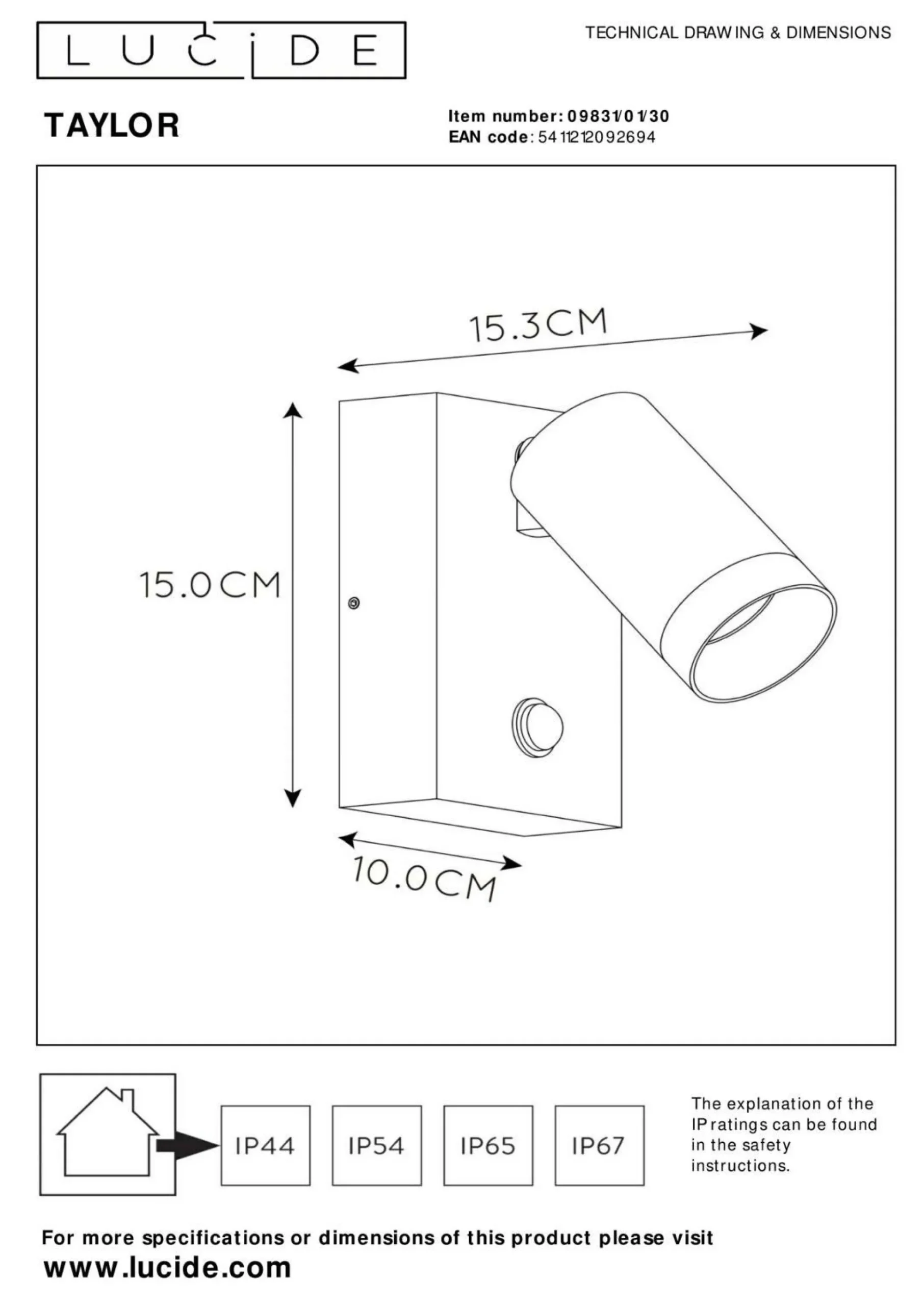 Die Wandleuchte TAYLOR wird für Sie Licht ins Dunkel bringen. Eine Option zum Dimmen ermöglicht eine individuelle Anpassung der Helligkeit. Alle Qualitäten und Highlights der Marke LUCiDE kommen in dieser Wandlampe zusammen. Aufgrund der Schutzart IP54 ist das Modell TAYLOR staubgeschützt und vor Spritzwasser gesichert. Dank des hübschen Designs ergänzt es das persönliche Einrichtungskonzept und wird auch im ausgeschalteten Zustand zum dekorativen Element. Die Leuchte weist ein Breitenmaß von 15,3 Zentimetern, ein Längenmaß von insgesamt 10 Zentimetern und ein Höhenmaß von 15 Zentimetern auf. Egal, in welcher Umgebung sie integriert wird, wird das Modell TAYLOR Ihrem Wohnraum eine schöne Note hinzufügen. Die Leuchte aus Aluminium kann auch optisch durch ihr modernes Design überzeugen. Sie weist eine GU10-Fassung auf. Das Modell TAYLOR eignet sich perfekt für die angenehme Beleuchtung Ihrer Räume und gibt Ihrer Einrichtung zusätzlichen Flair. Diese Wandlampe wird umgehend einen Platz in Ihrer Einrichtung finden.