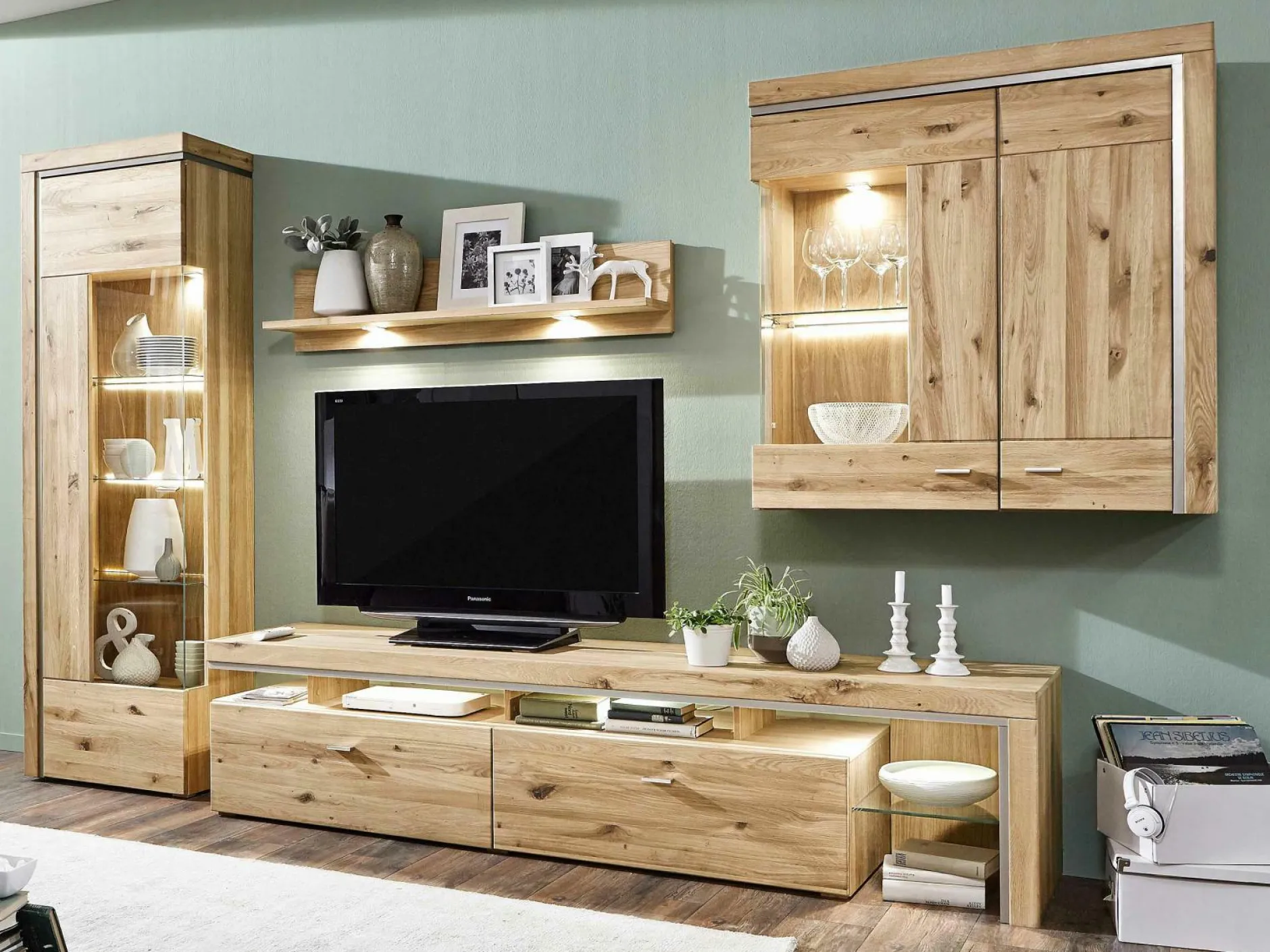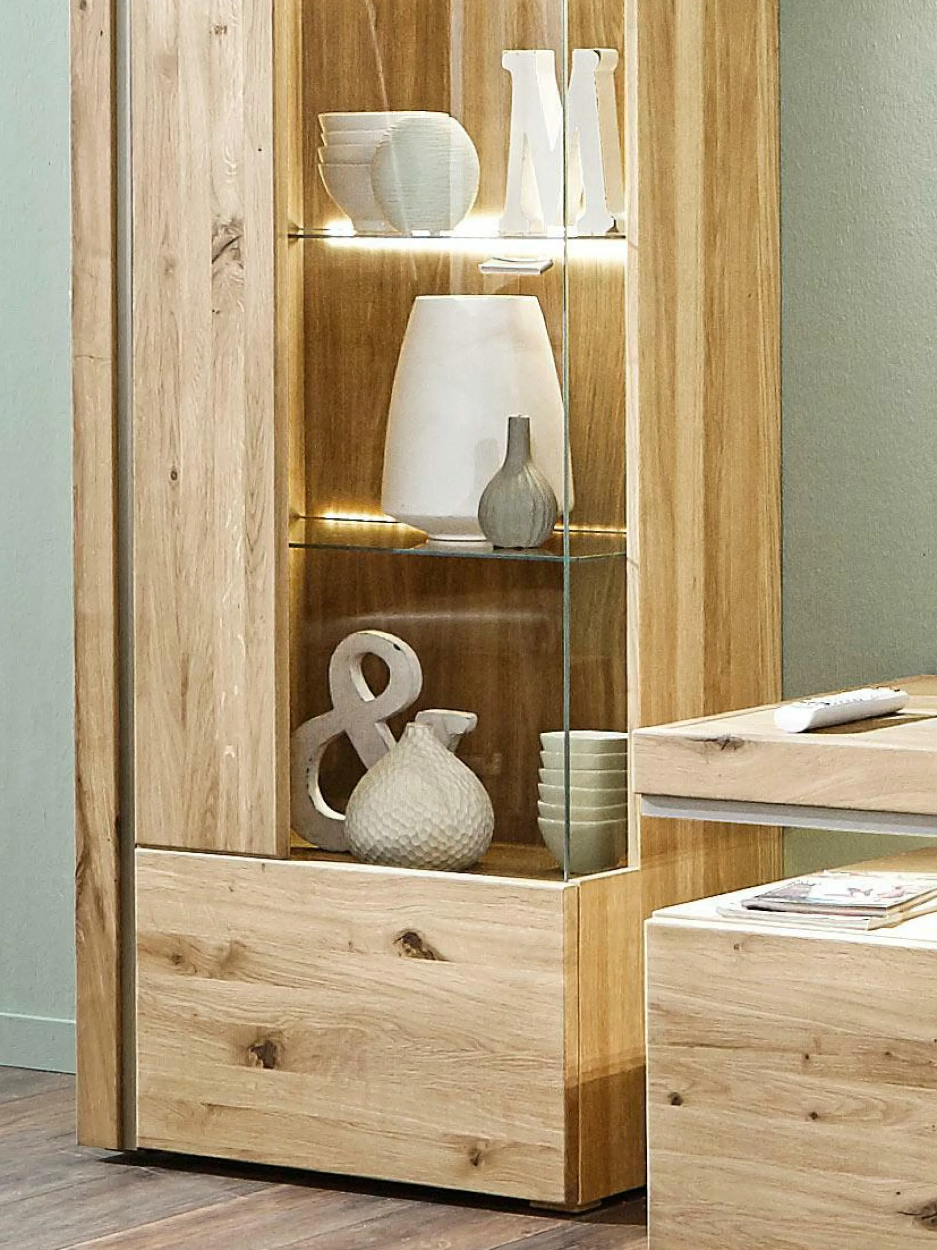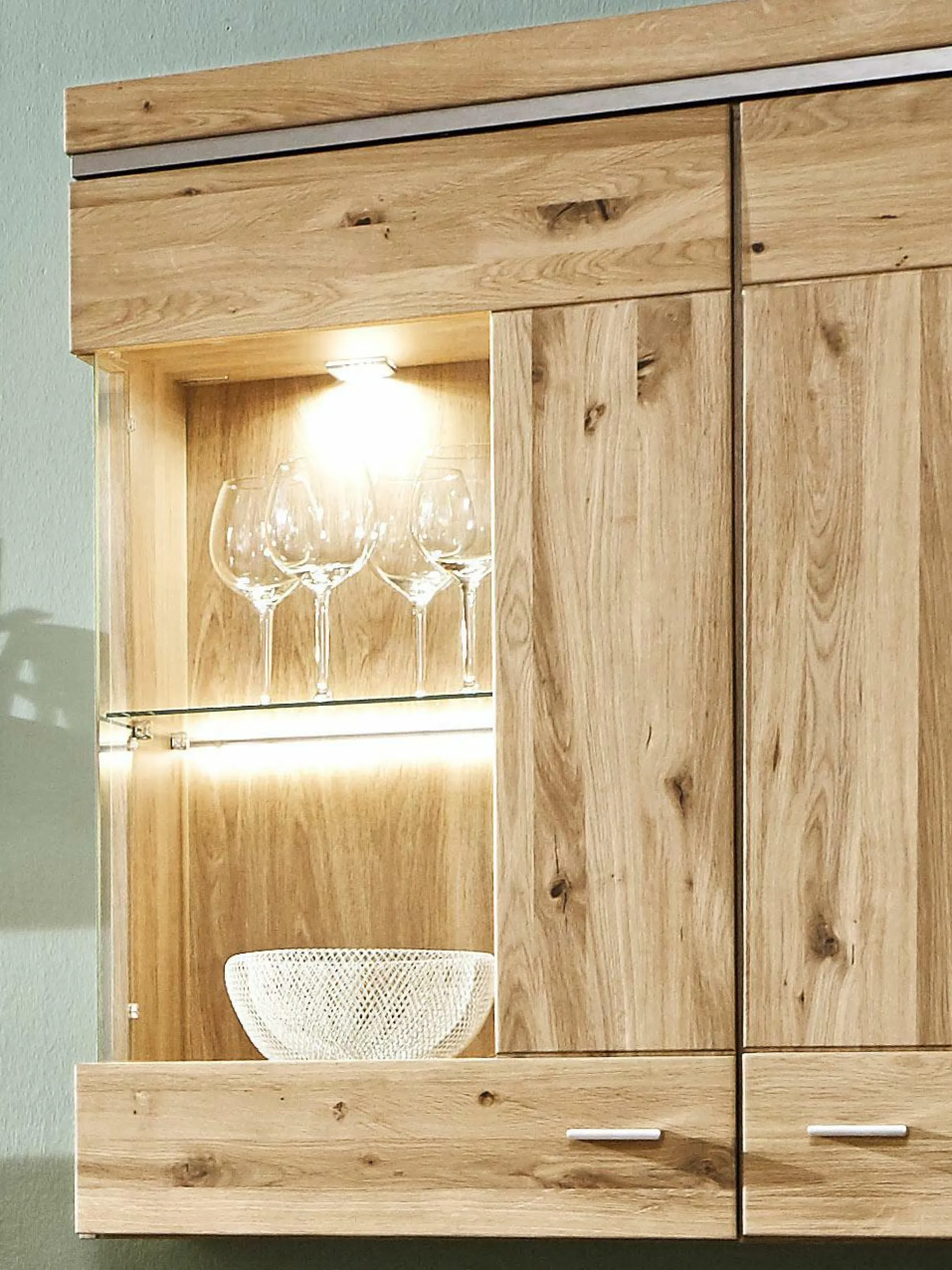 Korpus außen: Alteiche furniert Korpus innen: Alteiche foliert Front: Alteiche Lamelle massiv geölt Absetzung: Aluminiumprofil bestehend aus den Typen: 09, Vitrine BHT 64,8/201,4/37,7 1 Holz-/Glastür li. 03, Lowboard BHT 220,4/51,0/50,5 mit Umbau rechts 2 Schubkästen, 2 Fächer, 1 Fach mit Glasboden rechts 22, Wandboard BHT 122,4/25,6/22,0 Paneel mit 1 Holzboden 25, Hängevitrine BHT 99,8/104,4/37,7 1 Glas-/Holztür li. / 1 Holztür re. >>> Preis ohne Beleuchtung <<>> Breite = ca. Montagebreite <<<