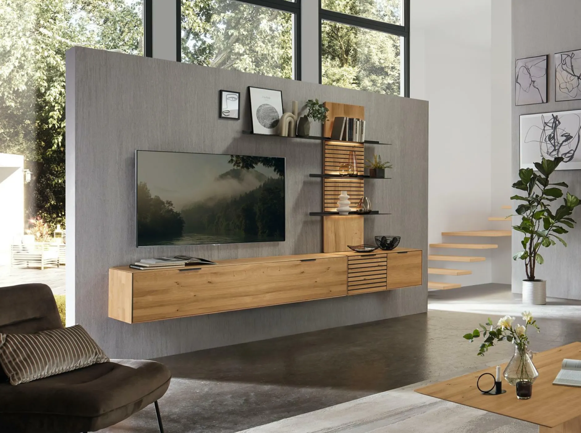 · bestehend aus: Hängelowboard mit einer Klappe und zwei Fächern B/H/T ca. 182 x 36 x 37 cm Hängelowboard mit zwei Holztüren und einem Fach B/H/T ca. 92 x 36 x 37 cm Paneelregal mit drei Metallablagen B/H/T ca. 145 x 138 x 24 cm