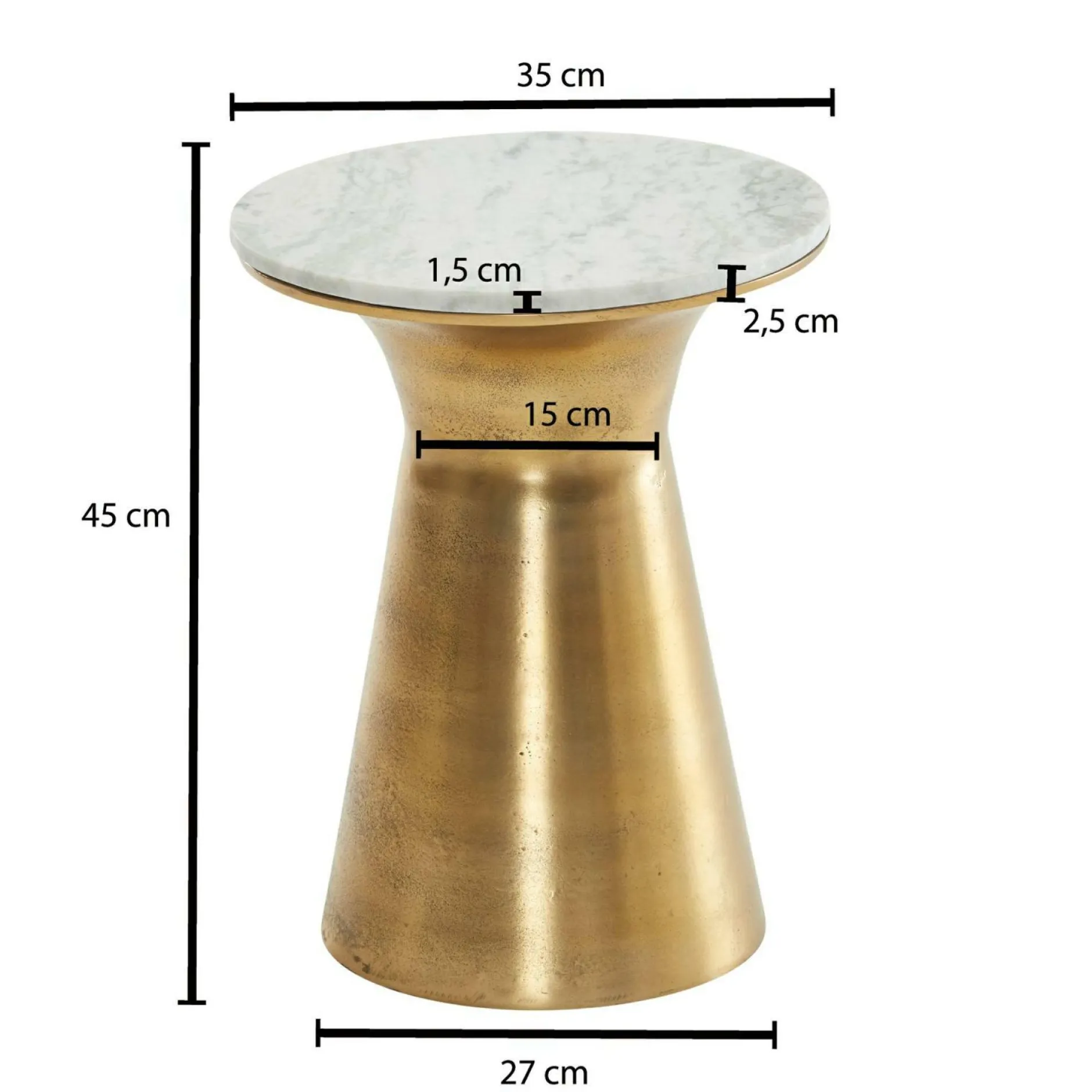 · Abmessungen – Durchmesser Tischplatte: 35 cm, Tischplattenstärke: 1,5 cm.