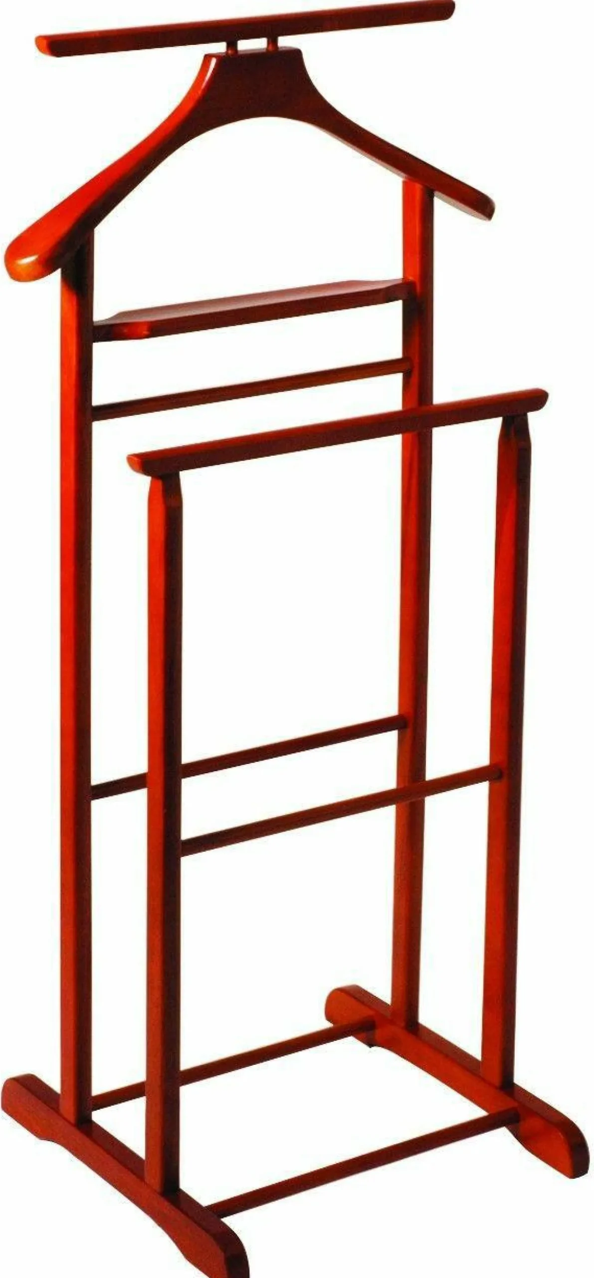 Dieser Herrendiener wurde aus kirschbaumfarbenem Massivholz gefertigt. Er präsentiert sich in einer leuchtenden Farbe, wodurch der Herrendiener in jedem Raum ein wahrer Hingucker ist. Er bietet Platz für Jacken, Gürtel, Oberteile und vieles mehr. Diese können faltenfrei und einfach aufgehängt werden.