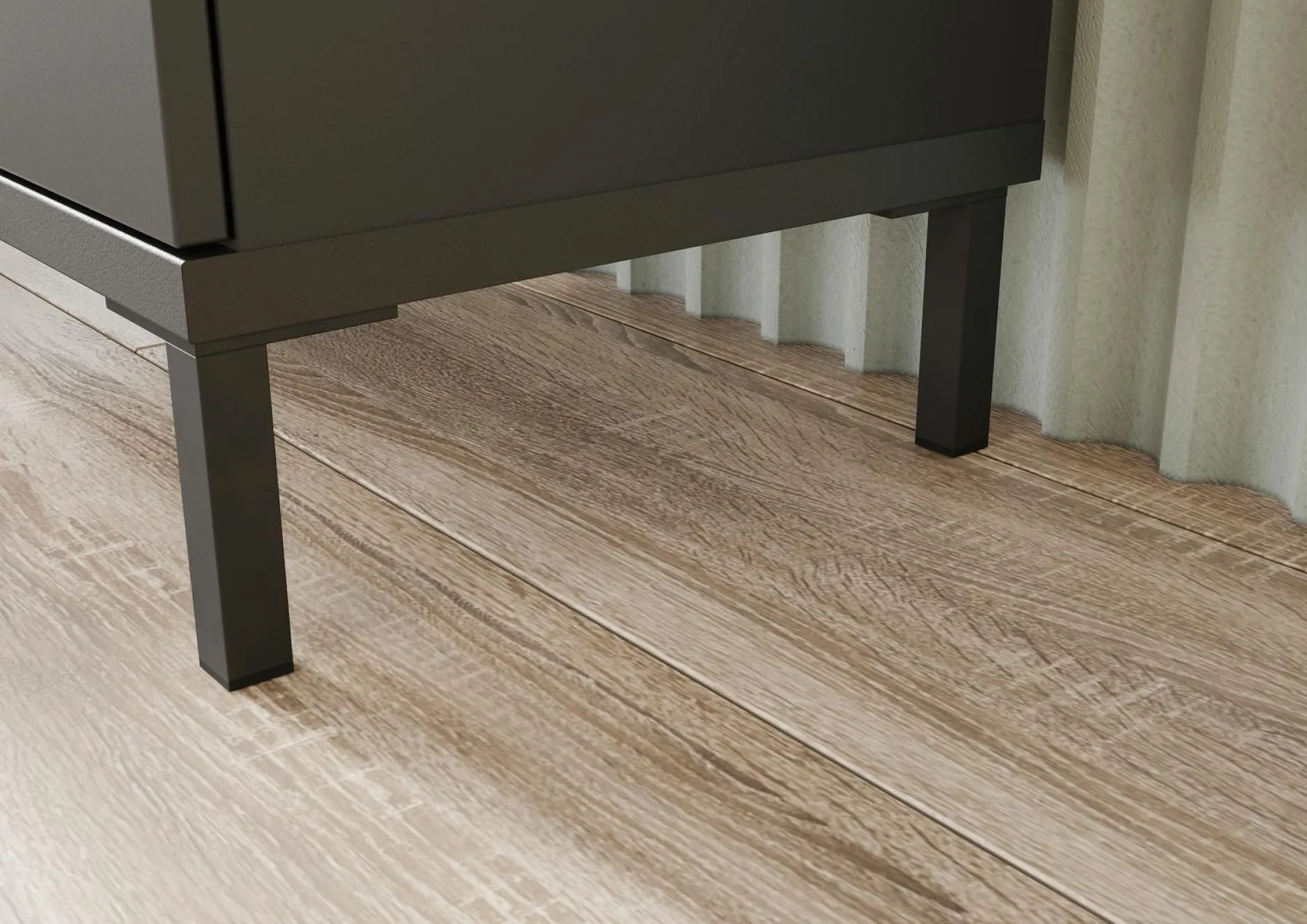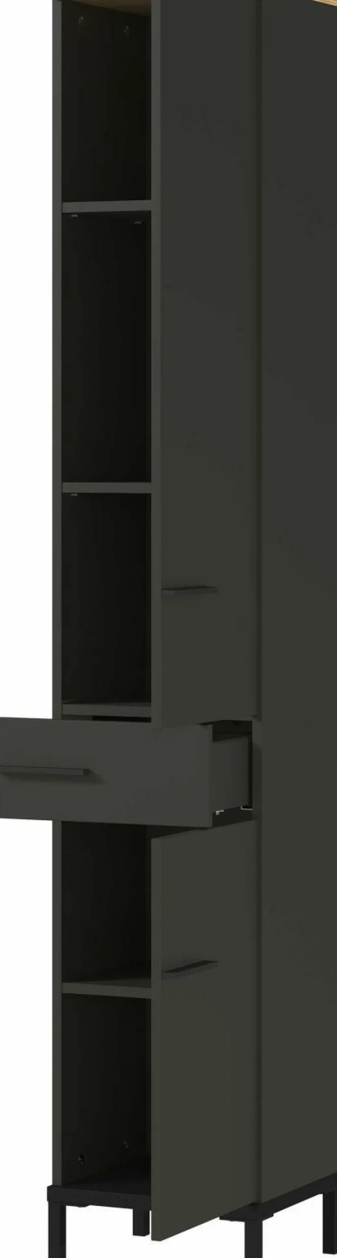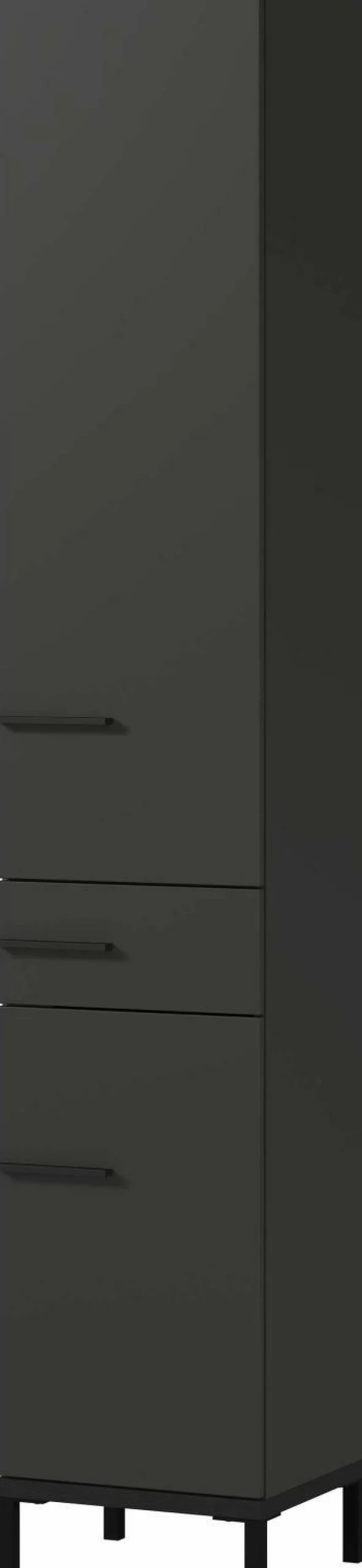 · Schrank mit einer Schublade (belastbar bis zu 10 kg) und zwei Türen – dahinter insgesamt drei verstellbare Einlegeböden (belastbar bis zu 10 kg), Unterboden in Schwarz (belastbar bis zu 15 kg), Oberboden in Navarra-Eiche-Nb., Rest in Graphit, drei Steggriffe und vier hohe Füße aus Metall in Schwarz, Melaminharzbeschichtung, hochwertige ABS-Kanten, Tür rechts/links anschlagbar, Türdämpfung, Selbsteinzug der Schublade, Made in Germany.