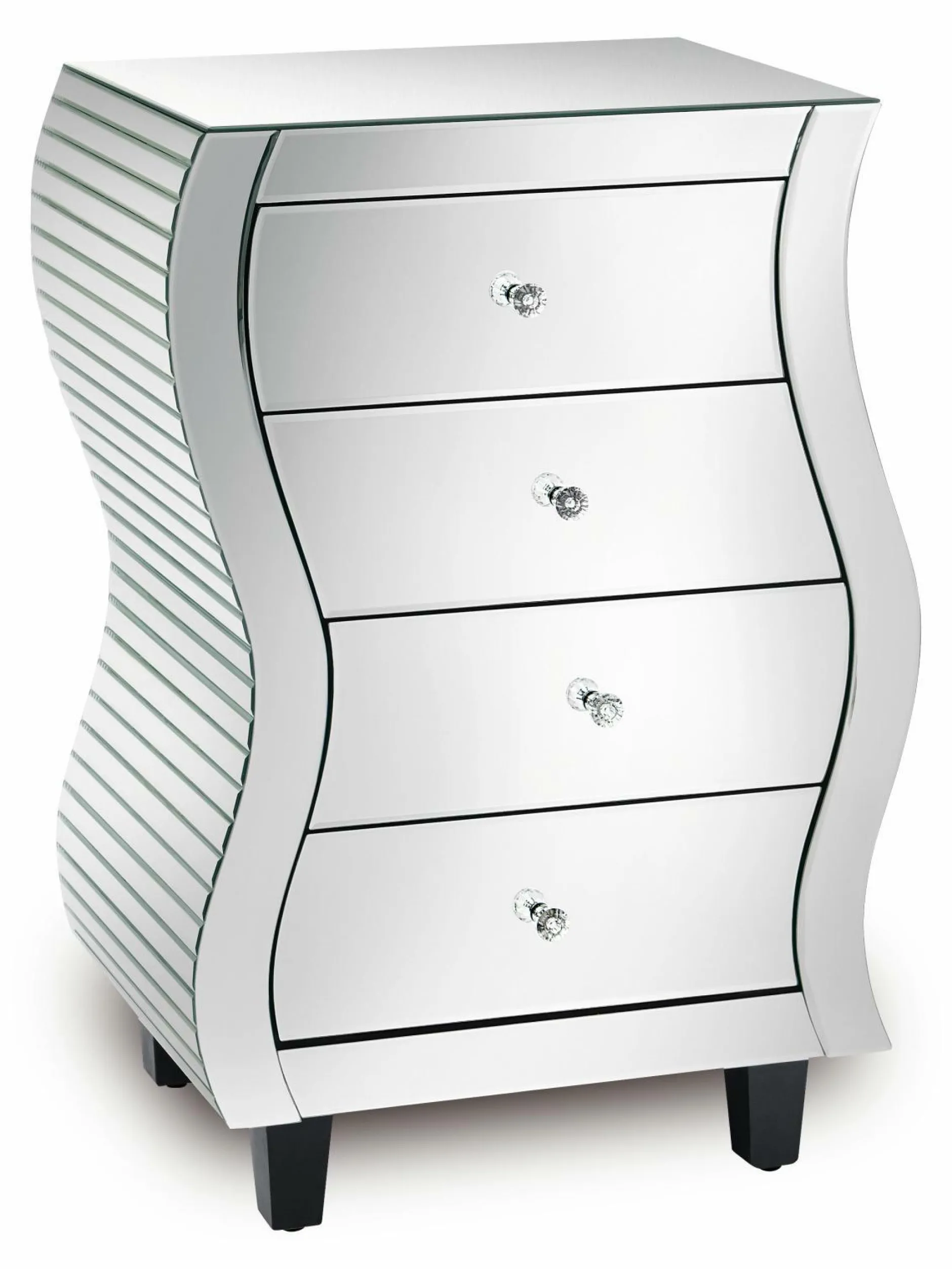Mit dieser Kommode holen sie sich ein extravagantes Möbelstück nach Hause. Hinter den vier Schubladen verbirgt sich ausreichend Platz für Ihre Kleidungsstücke. Durch die Gestaltung aus Spiegelglas lässt sie Ihren Wohnraum größer wirken und sieht auch noch grandios aus. Die schwungvolle Form in einem Wellen-Muster wirkt lebensfreudig und charmant.