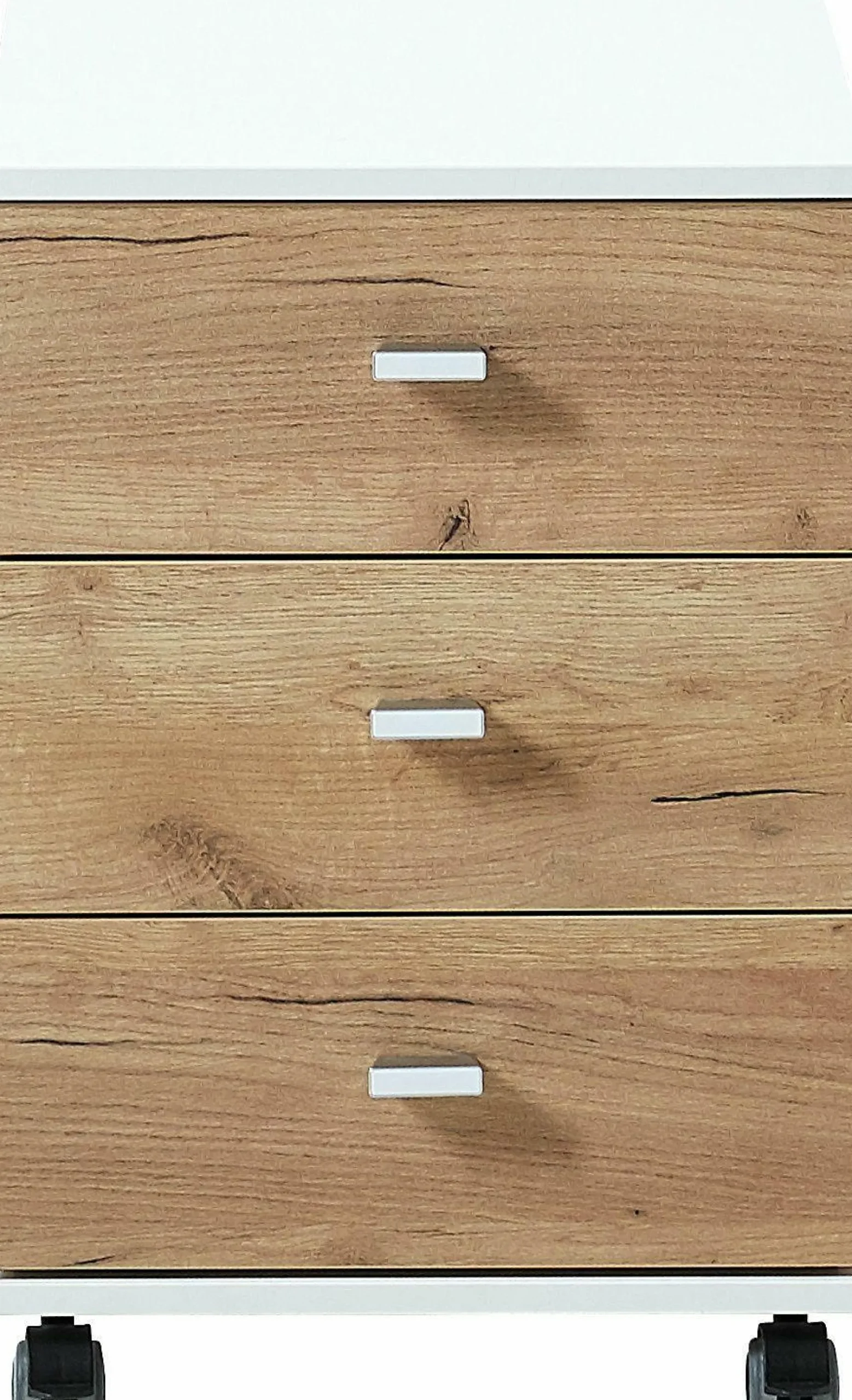 · Rollcontainer mit drei Schubkästen (jeweils belastbar bis zu 5 kg), Oberboden (belastbar bis zu 20 kg), auf vier praktischen Laufrollen – zwei davon mit Feststellbremse, Korpus in Weiß, Schubkastenfronten in Navarra-Eiche-Nb., drei Steggriffe aus Kunststoff in Silber, hochwertige ABS-Kanten, Melaminharzbeschichtung, Made in Germany.