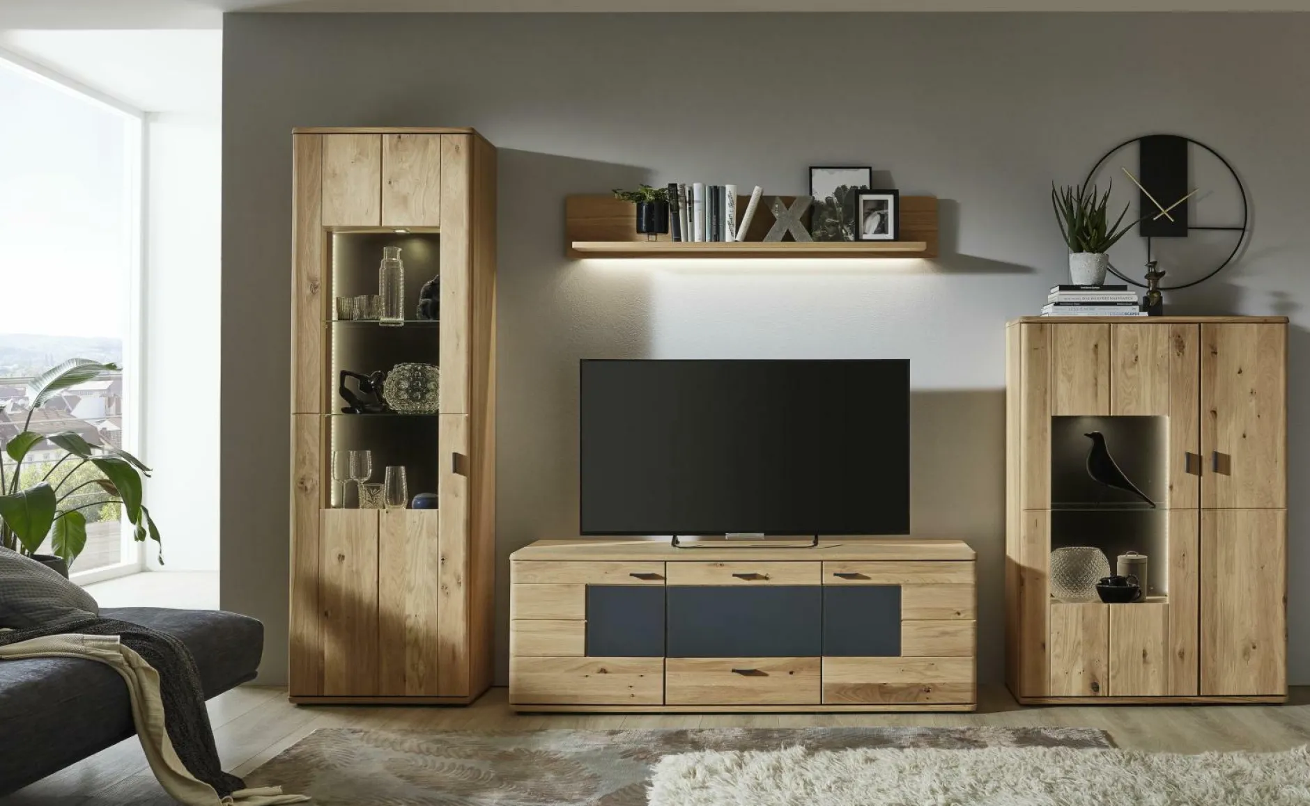 Die Wohnwand Faith von der Trendmarke Vito überzeugt mit seinem schlichten aber dennoch eleganten Design. Die hochwertige Verarbeitung der furnierten Alteiche zeigt sich besonders in der ausgezeichneten Bearbeitung der Holzoberflächen, die durch eine vorab durchgeführte Ölung eine wohlige sowie heimische Atmosphäre erzeugen. Die Front besteht aus massiver Alteiche (Lamelle). Durch die eleganten Absetzungen durch Grauglas wird das Design der Wohnwand perfekt abgerundet. Die Glaselemente werden aus Parsolglas hergestellt. Jegliche Schubkästen sind mit Selbsteinzug und Dämpfung versehen und sorgen so für einen hohen Komfort. Bestehend aus einer Vitrine auf der linken Seite, einem Lowboard, einem Wandboard sowie einem Highboard bietet diese Wohnwand mehr als genug Stauraum und Ablagefläche. Mit separat erhältlichen LED-Beleuchtungen können Sie Ihre besonderen Gegenstände perfekt in Szene setzen.
