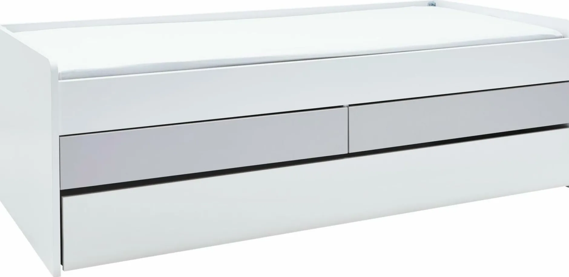 Korpus + RBK lichtweiß STAU-SK sandgrau 2 Schubkästen, LF unten 90×190 cm L 205 H 66 cm — ohne Lattenroste und Matratzen — — ohne Hängetisch —