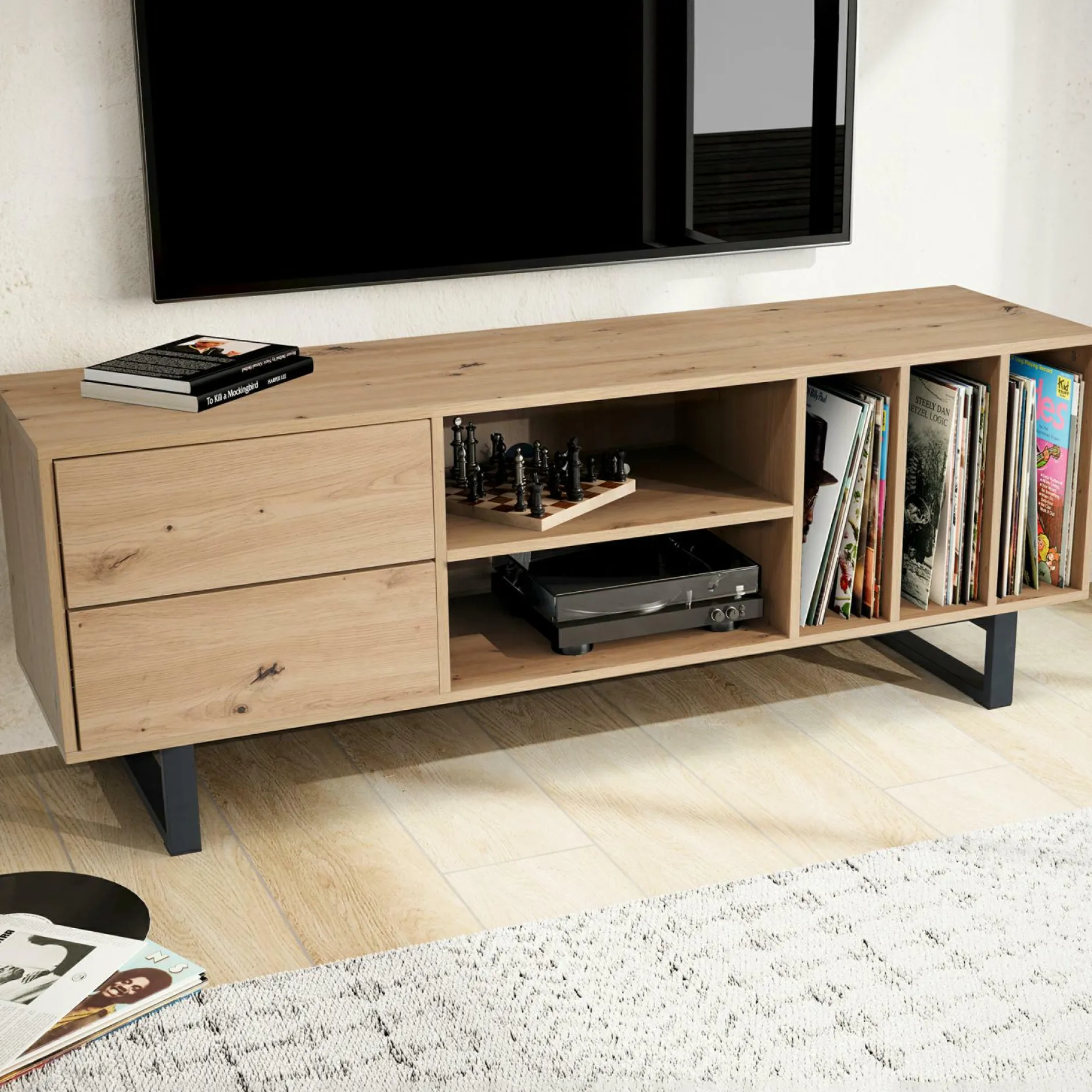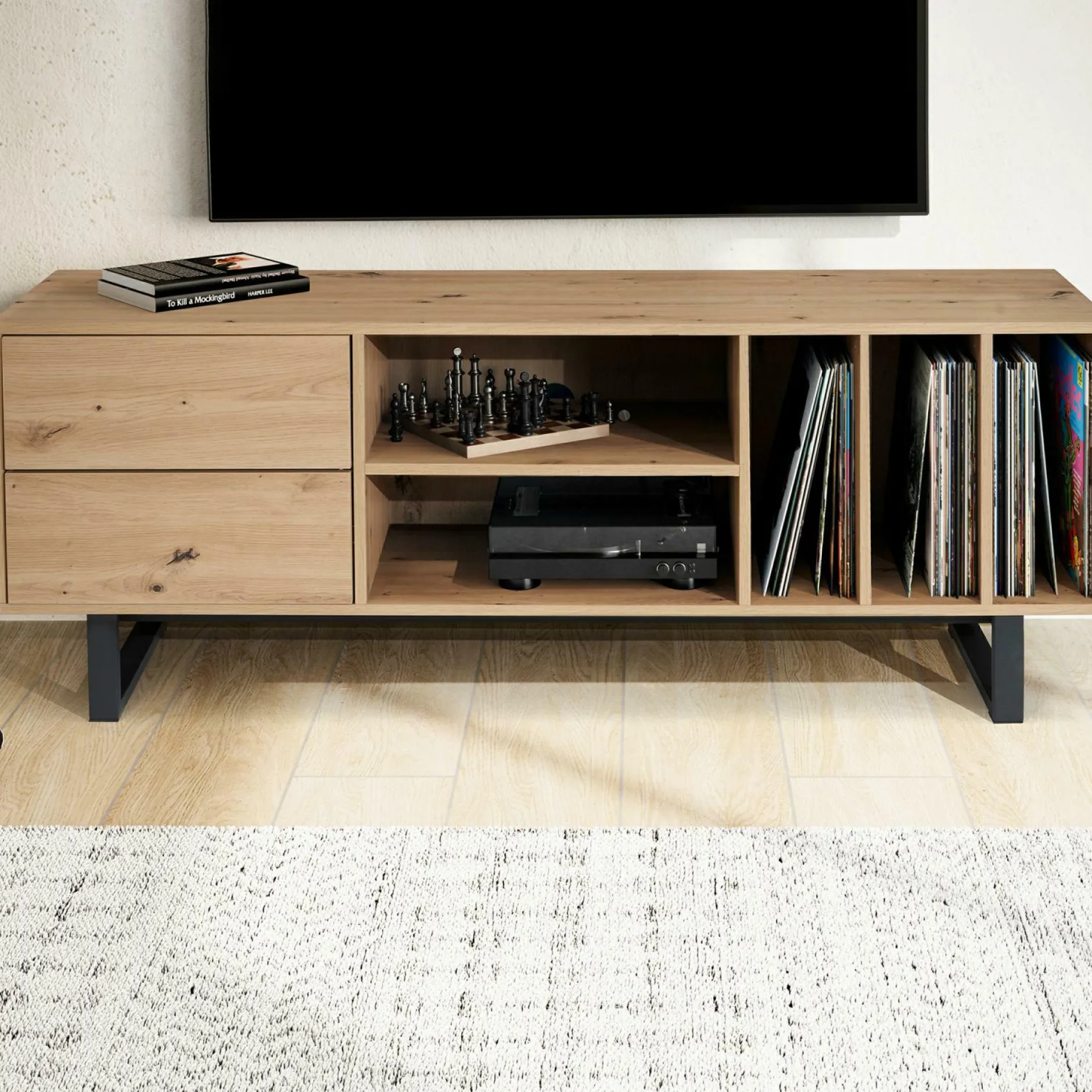· Lieferumfang – Ein Fernsehunterschrank ohne Dekoration. Lieferzustand: demontiert und sicher verpackt. Montagematerial und -anleitung liegen der Lieferung bei.