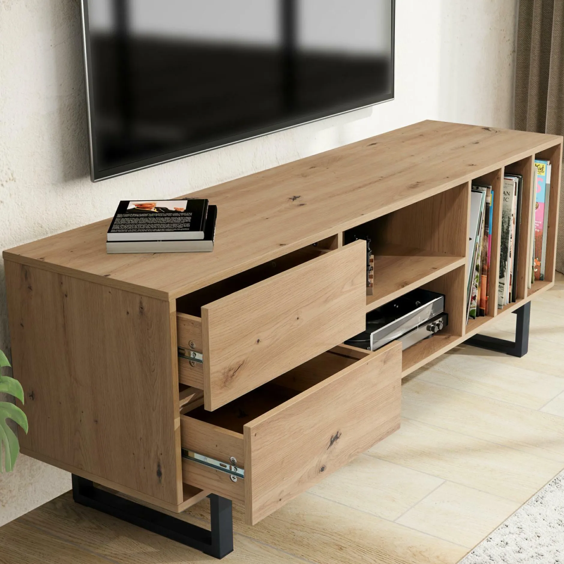 · Modern & Funktional – Entdecke unseren Stilvollen TV-Unterschrank mit Eiche-Dekor, ideal für bis zu