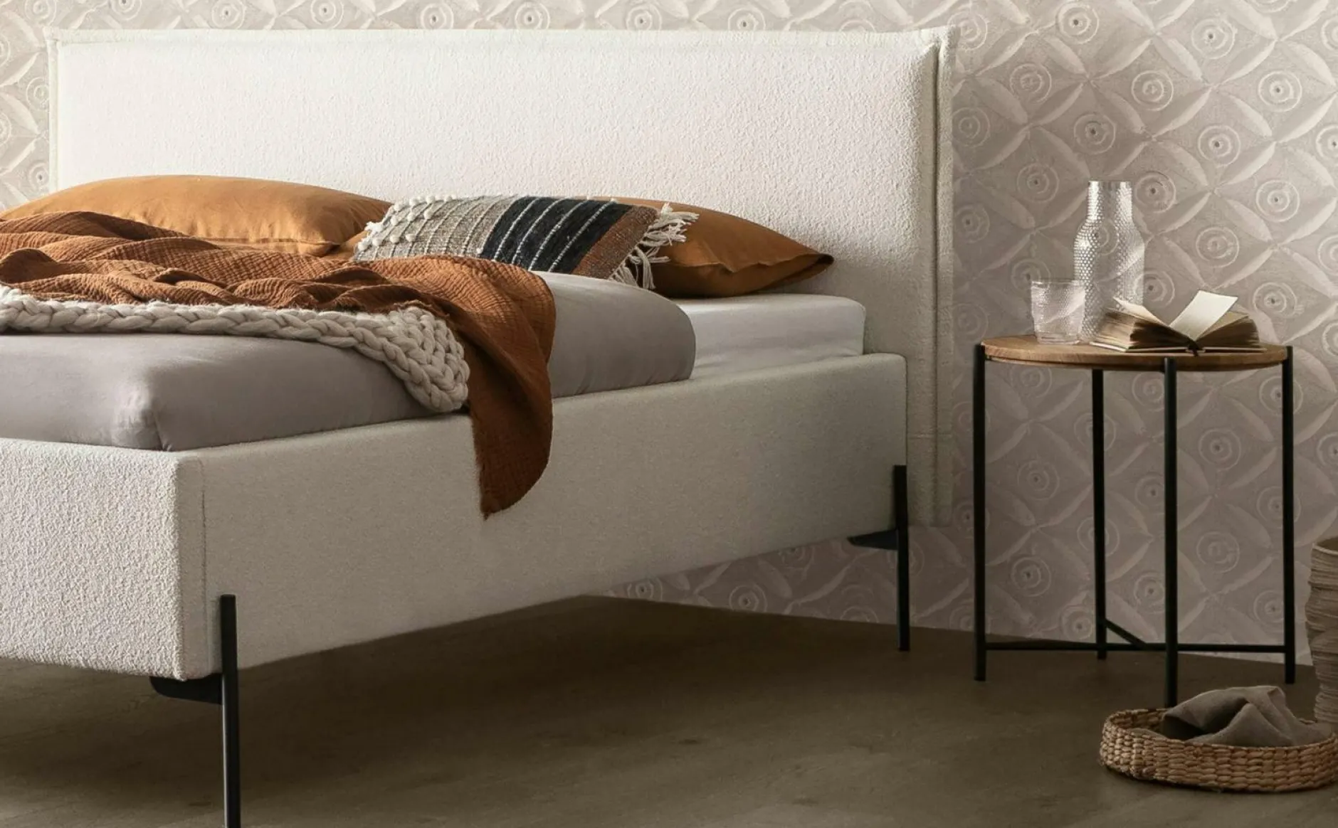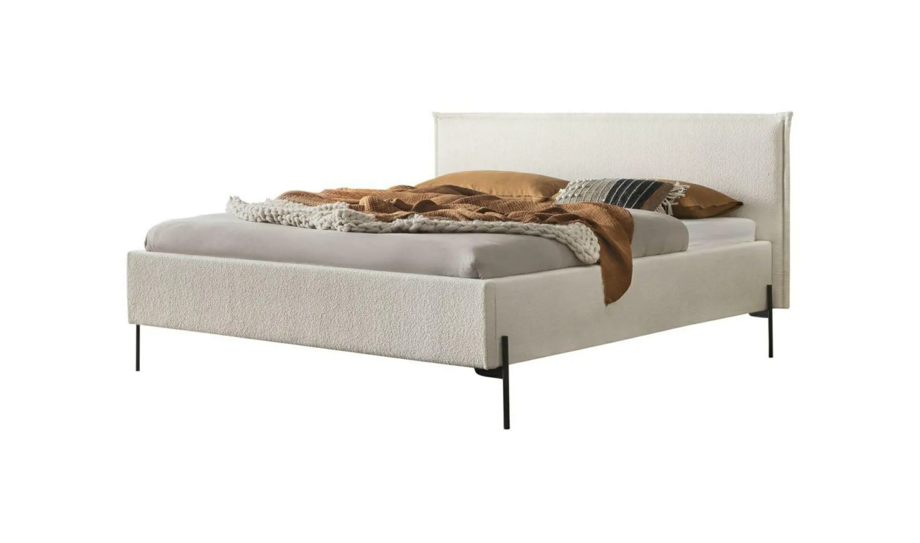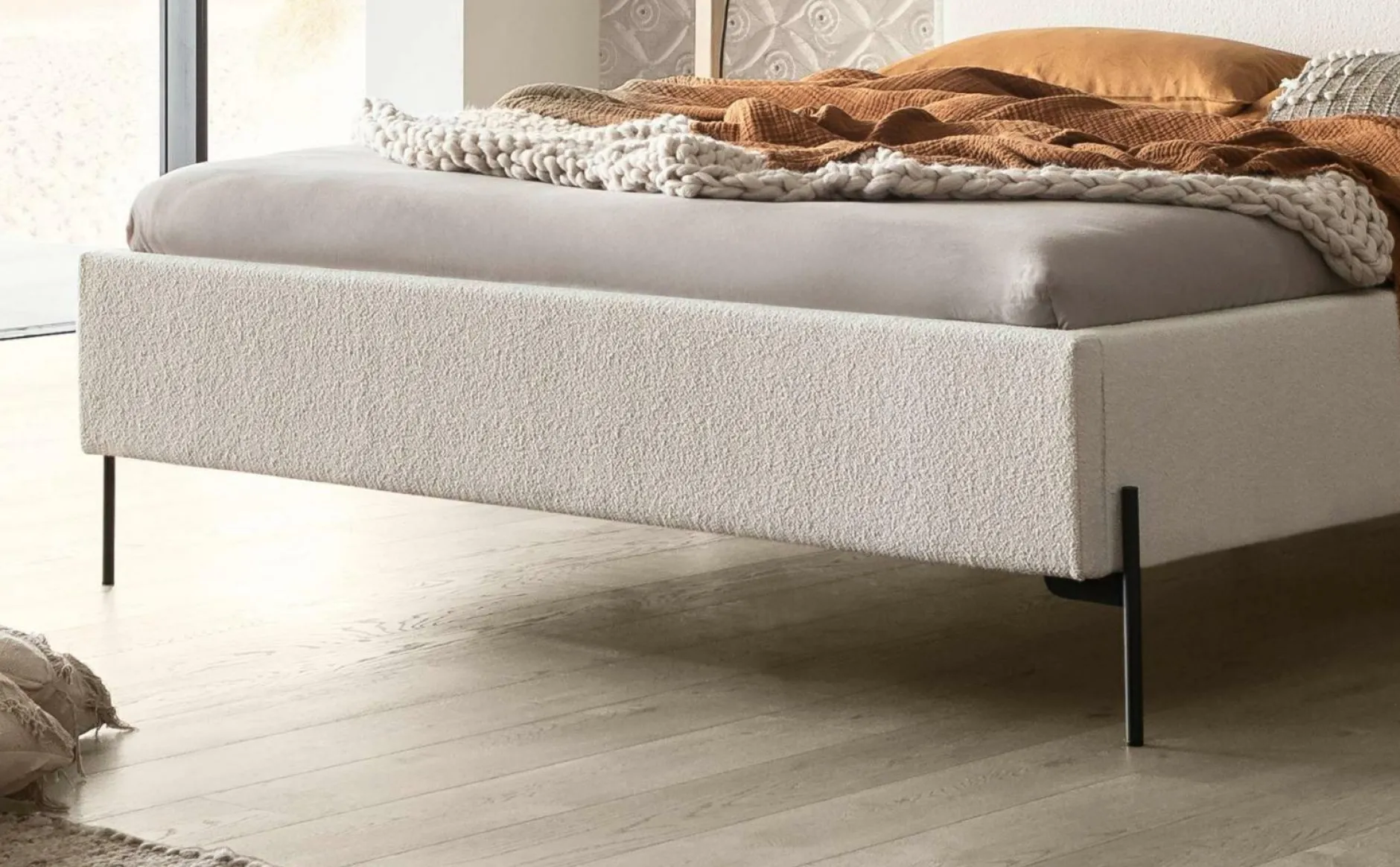 · Das Bett Nora fasziniert durch seine minimalistische und klare Formensprache im klassisch monochromen Look. Die feinen, geradlinigen Metallfüsse in anthracit setzen einen starken Akzent zum unregelmässig gekräuselten Boucle-Polster. Sie lenken den Blick auf den weichen Stoff mit Vintage-Charakter und lassen das wolkig anmutende Bett regelrecht schweben.